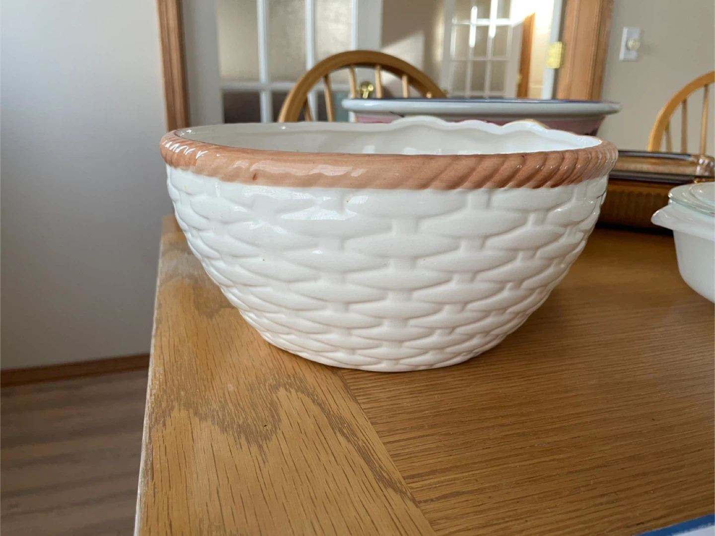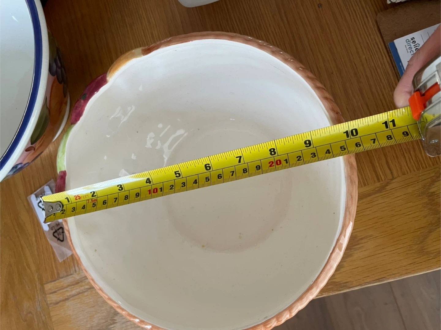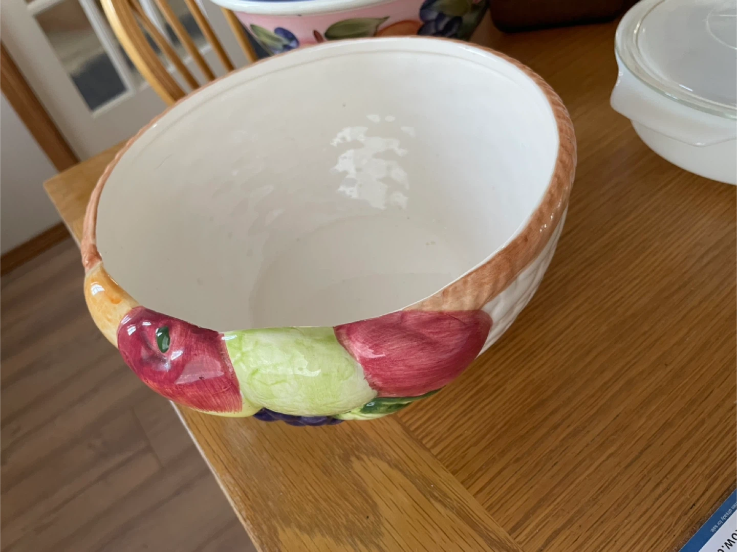Ceramic fruit basket bowl with a woven pattern and colourful fruit decorations. It's a lovely decorative piece for any kitchen counter. Great for holding fruit or other items!