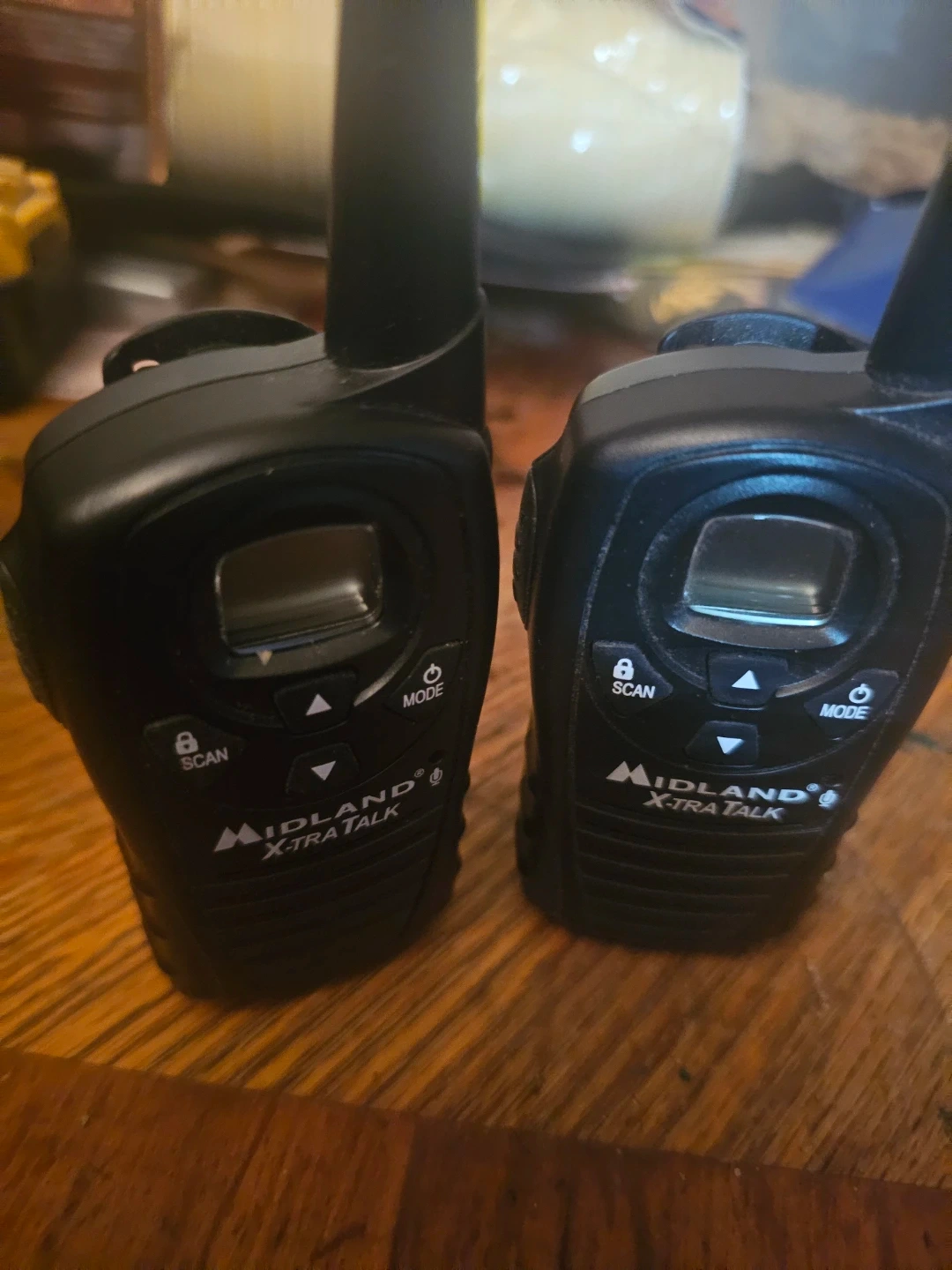Two Midland X-TRA TALK walkie talkies. These units are black and feature a scan function and mode button. They're great for staying in touch on camping trips or at outdoor events!
