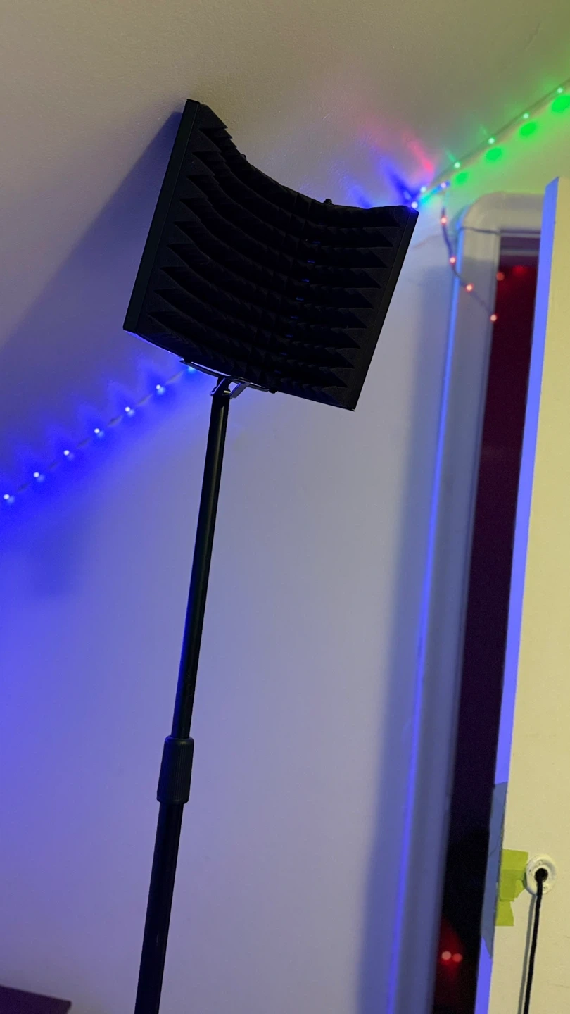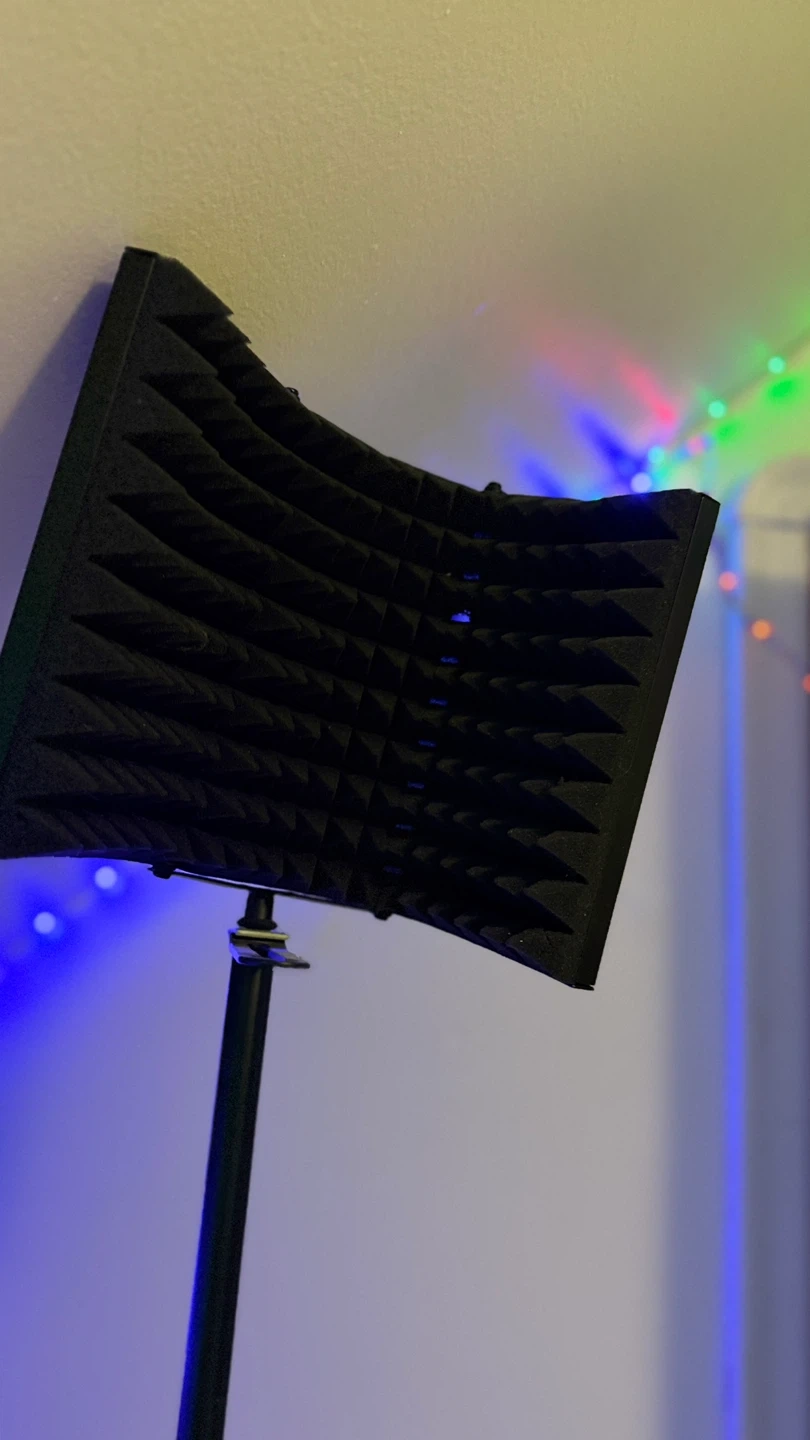 This portable microphone isolation shield helps reduce room noise and reflections. It's made of sound-absorbing foam. Great for home studios or on-the-go recording!