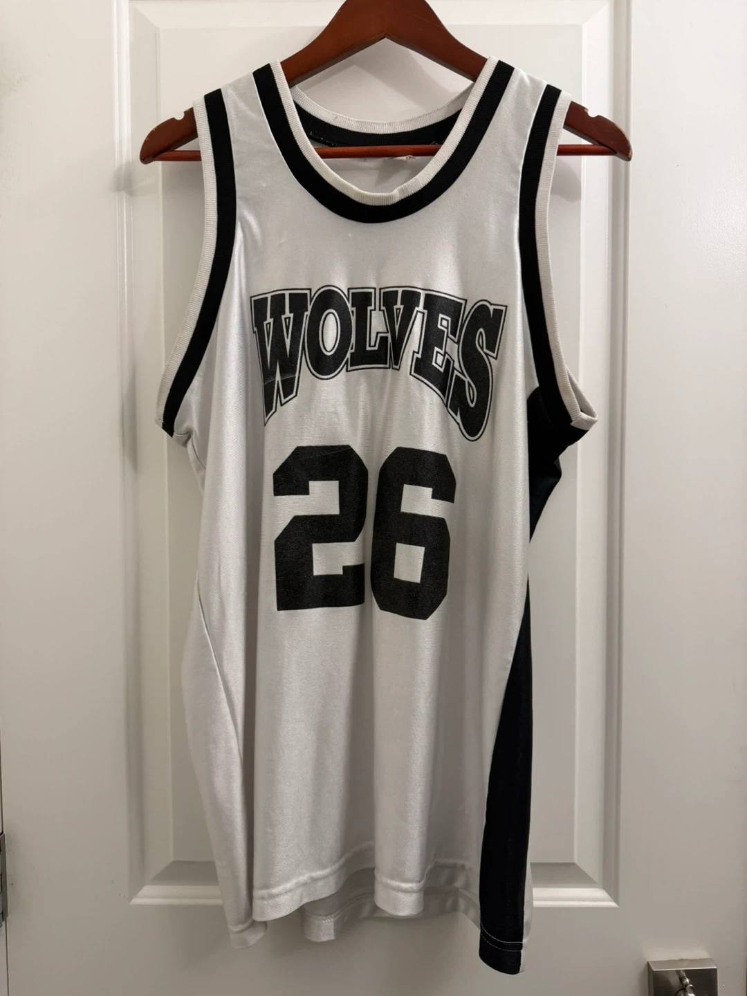 This is a white and black basketball jersey with "WOLVES" and the number "26" printed on the front. It's a sleeveless design with black trim around the neckline and armholes. This jersey is suitable for sports or casual wear.