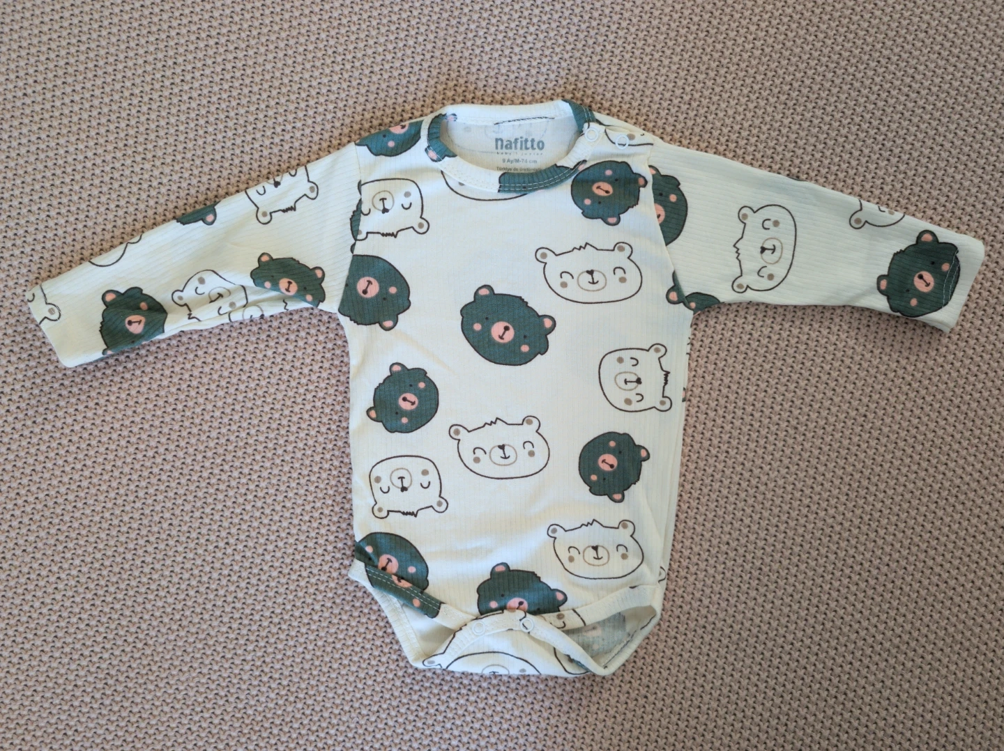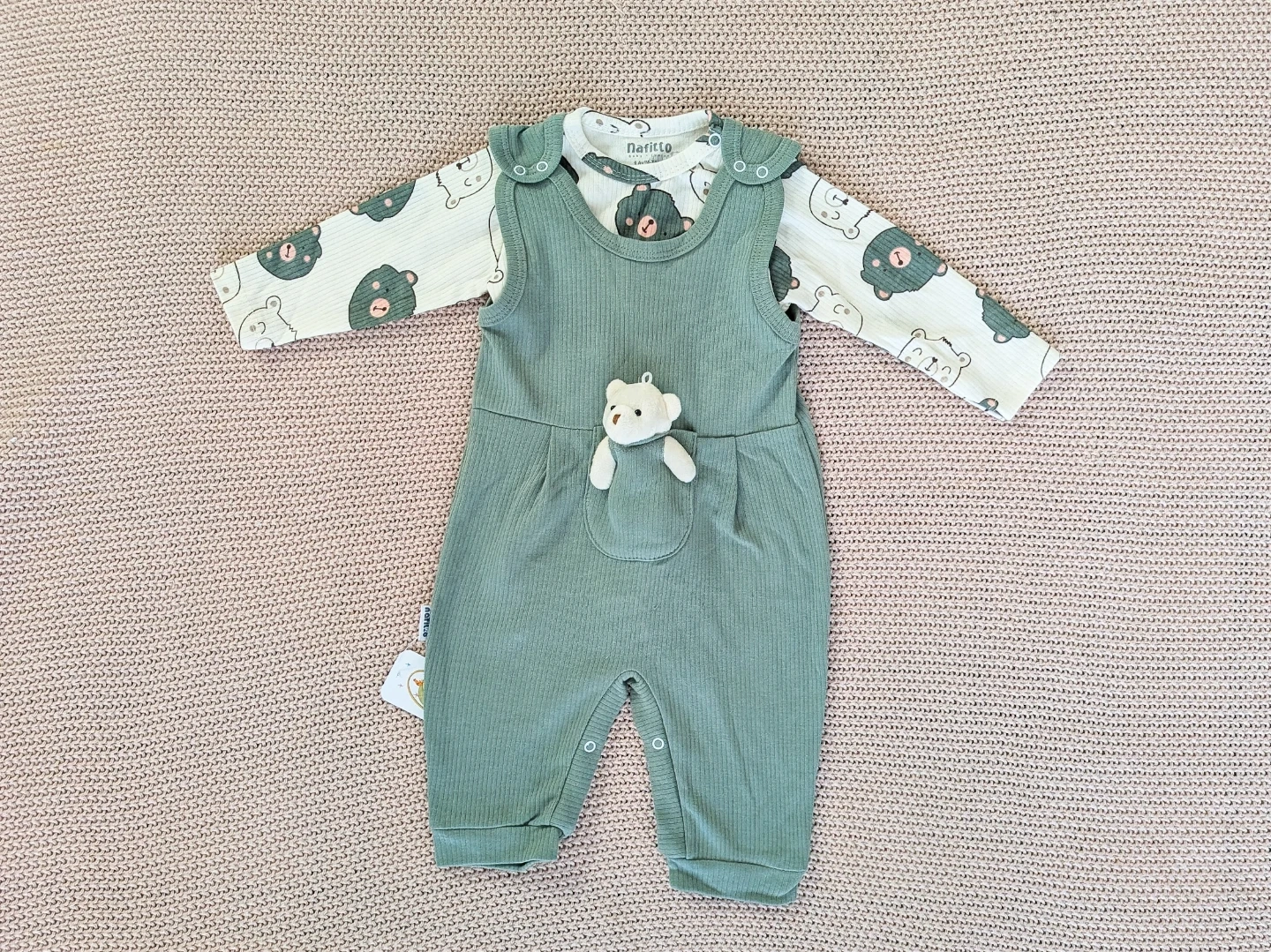 Adorable Nafitto baby set featuring a sage green ribbed romper with a stuffed bear detail and a matching long-sleeve bodysuit with a cute bear print. The set includes a bodysuit and overalls.