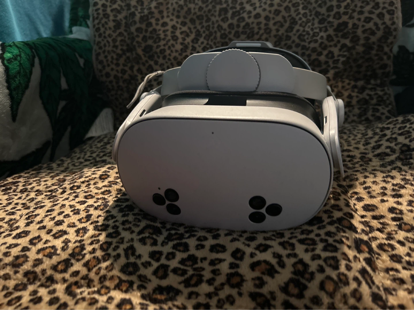 White Meta Quest 2 VR headset. Includes adjustable head strap and facial interface for comfort. It's designed for immersive virtual reality experiences.