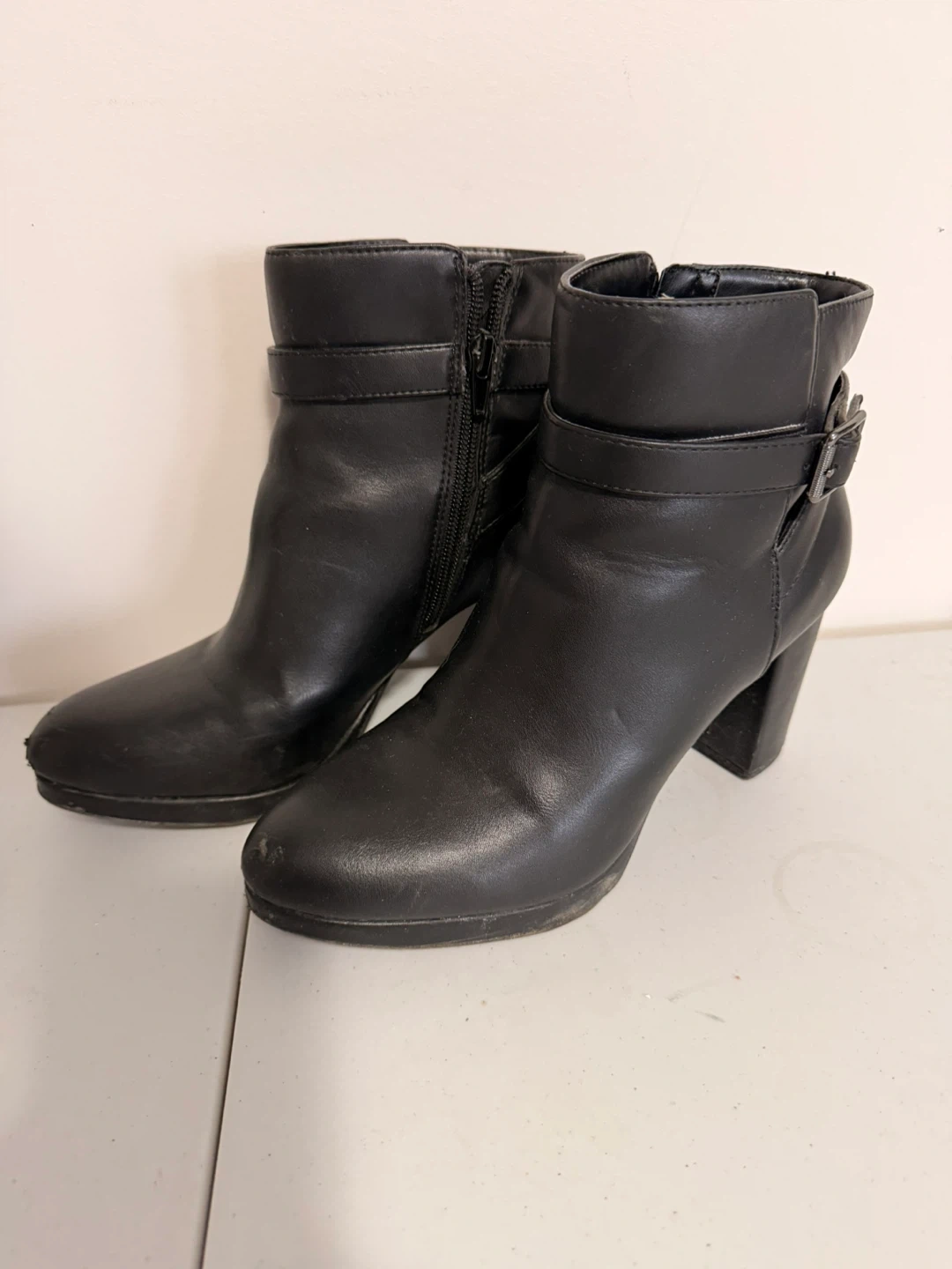 These black ankle boots are by Kelly & Katie. They feature a man-made upper, lining, and sole. They're a size 8M, with a side zipper and buckle detail.
