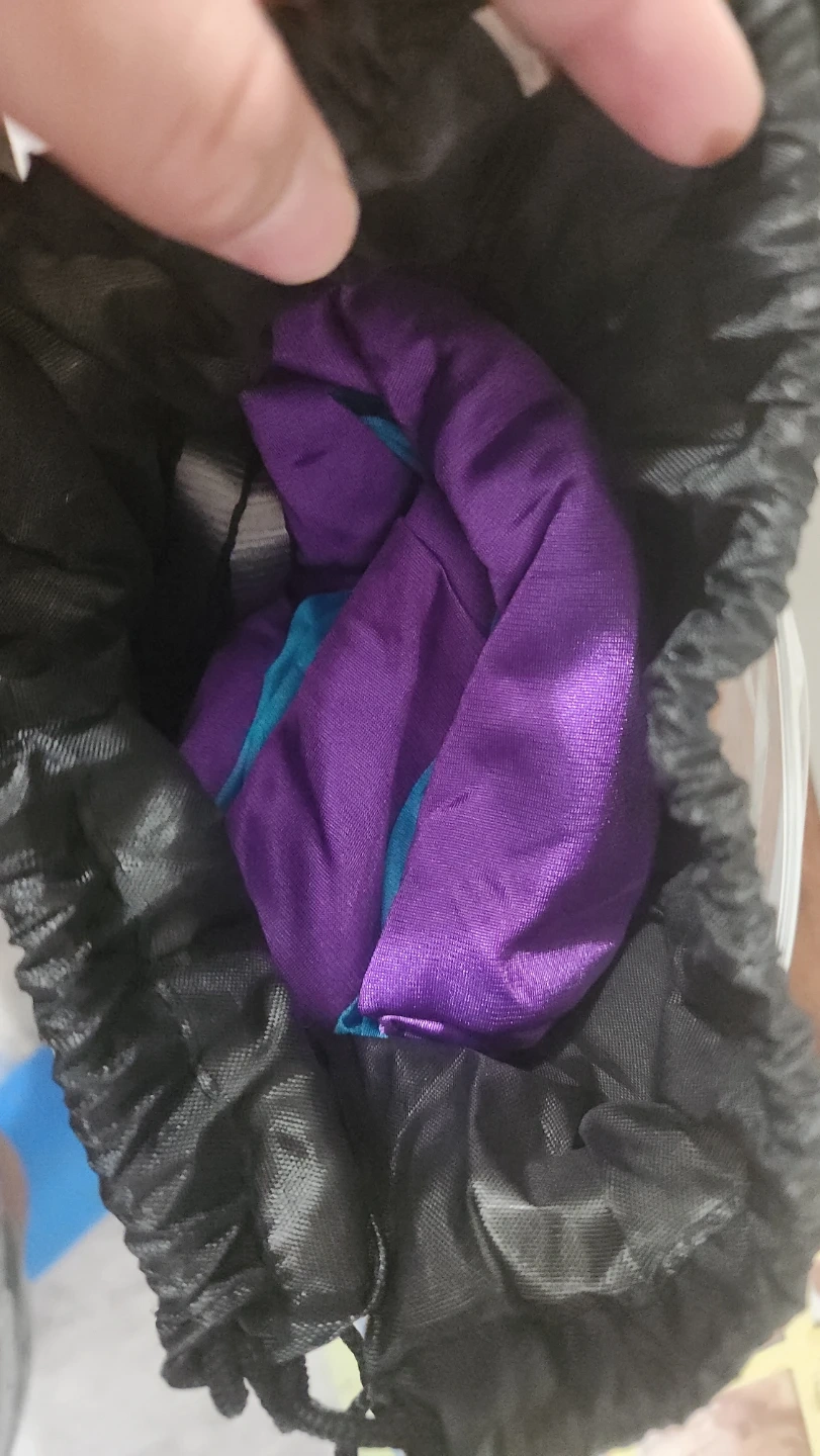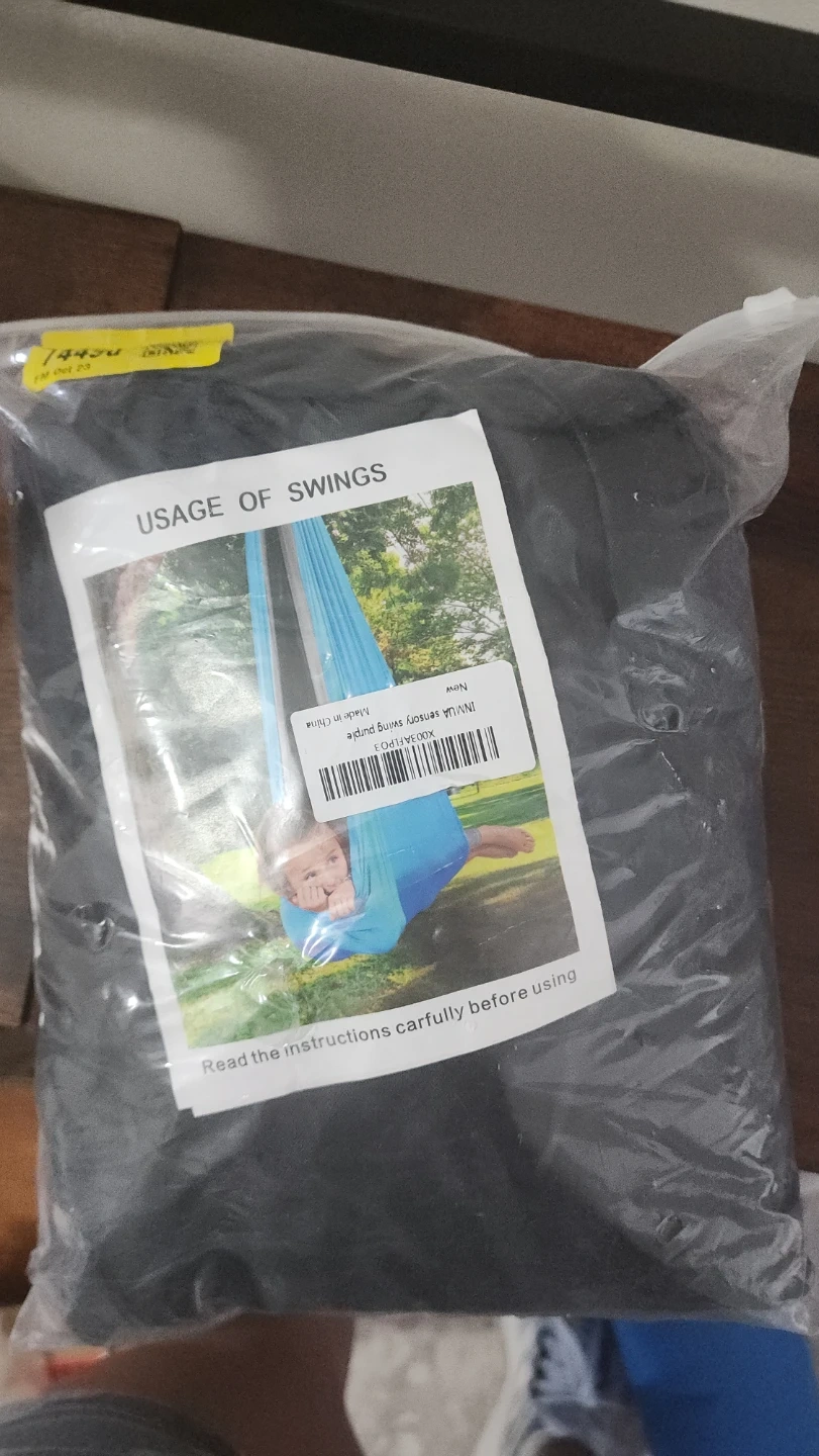 This is a sensory swing, coloured purple and teal. It comes with a black drawstring bag for storage. It's suitable for indoor or outdoor use.