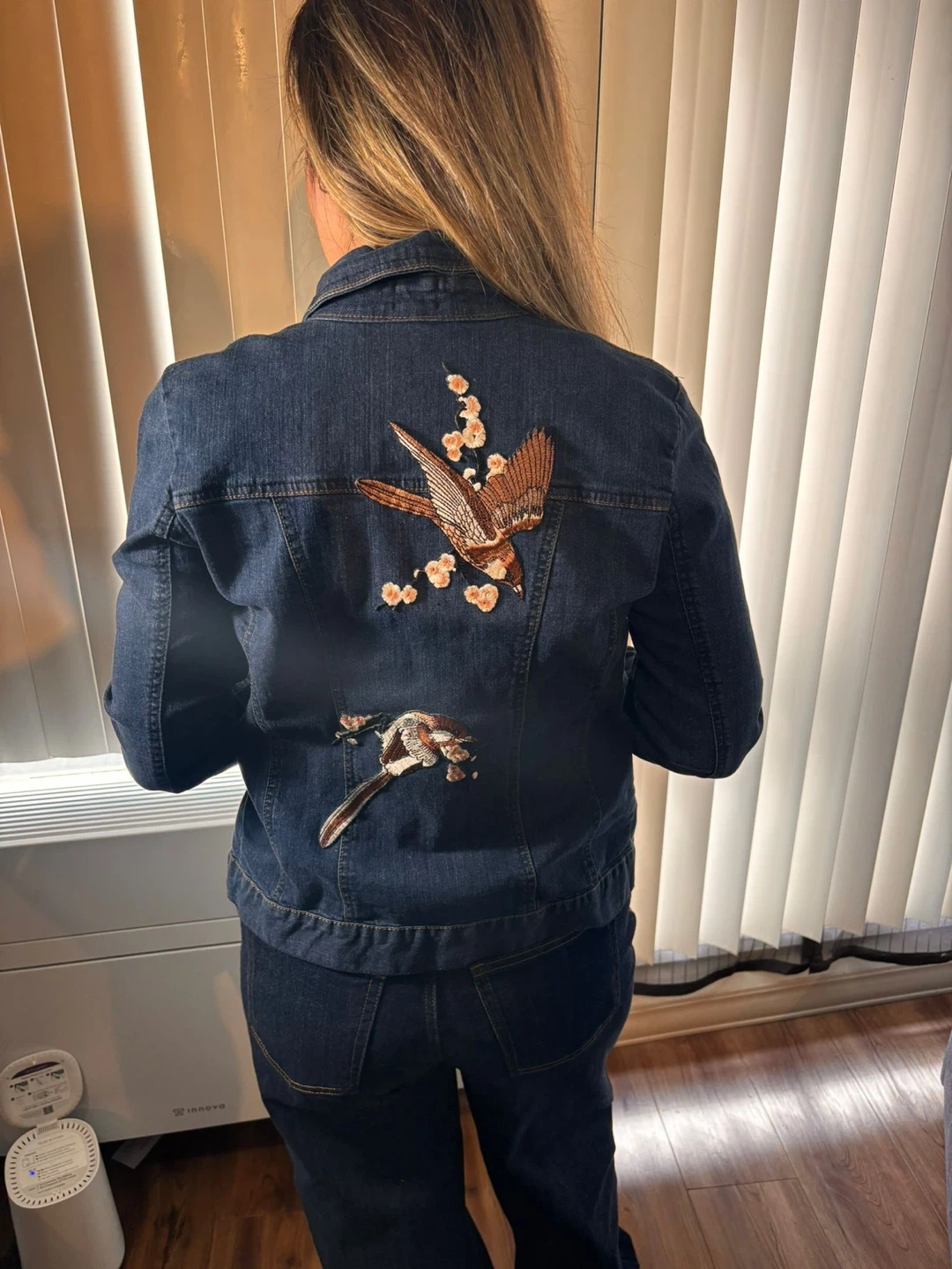 Cute denim jacket with unique bird embroidery on the back! It's a stylish piece that adds a bit of flair to any outfit. Perfect for layering or wearing on its own during the warmer months