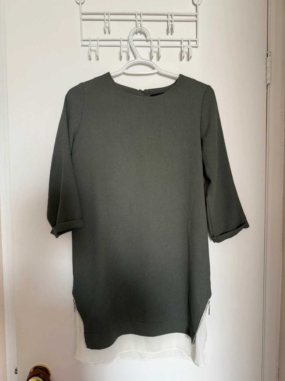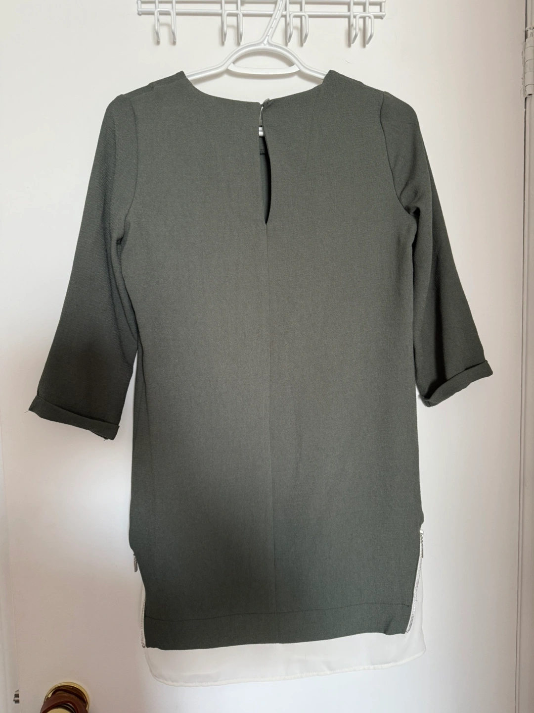 Olive green top with 3/4 sleeves. Features a round neckline and a white hem. The back has a keyhole design and two zippers.
