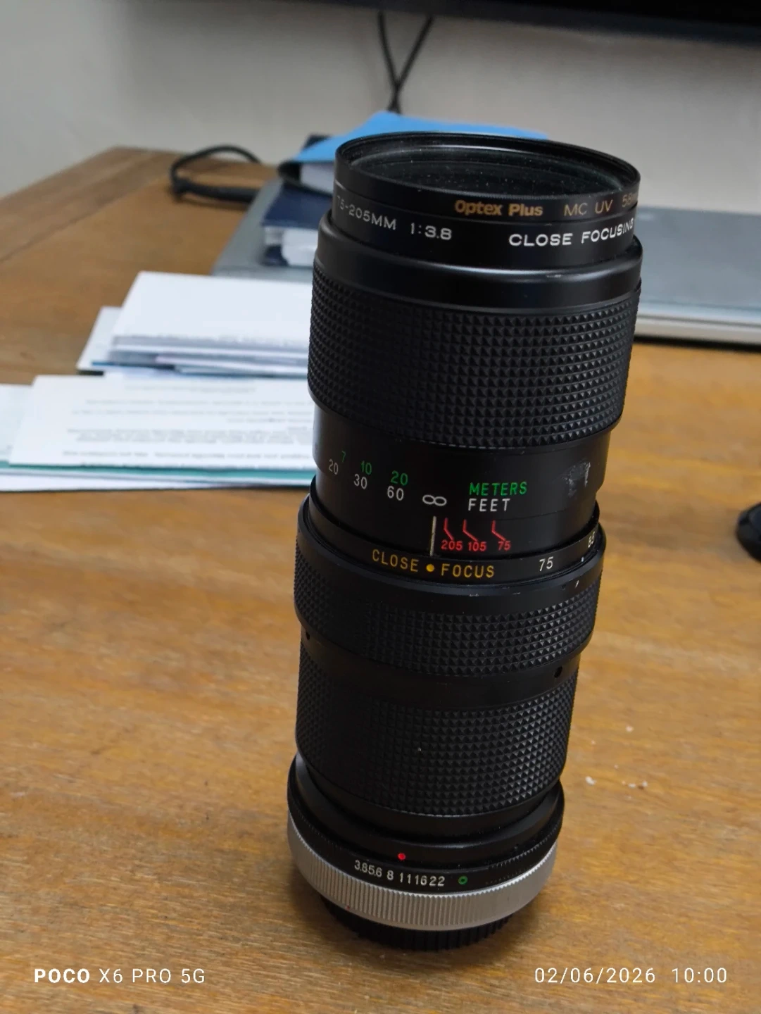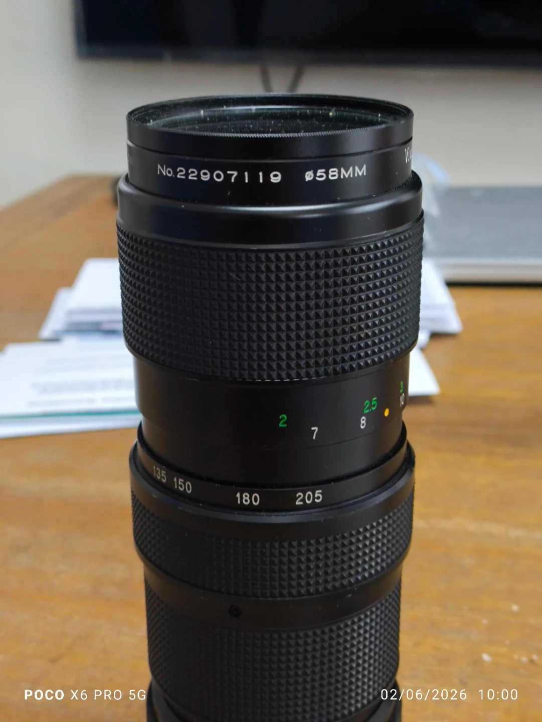This is a Vivitar 75-205mm zoom lens with a maximum aperture of f/3.8. It has a filter thread size of 58mm. This lens offers close focusing capabilities. Great for telephoto shots!