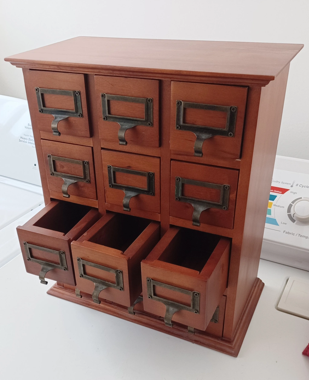 Here's a lovely wooden apothecary cabinet! It features 12 drawers, perfect for storing small items or adding a touch of vintage charm to your space.