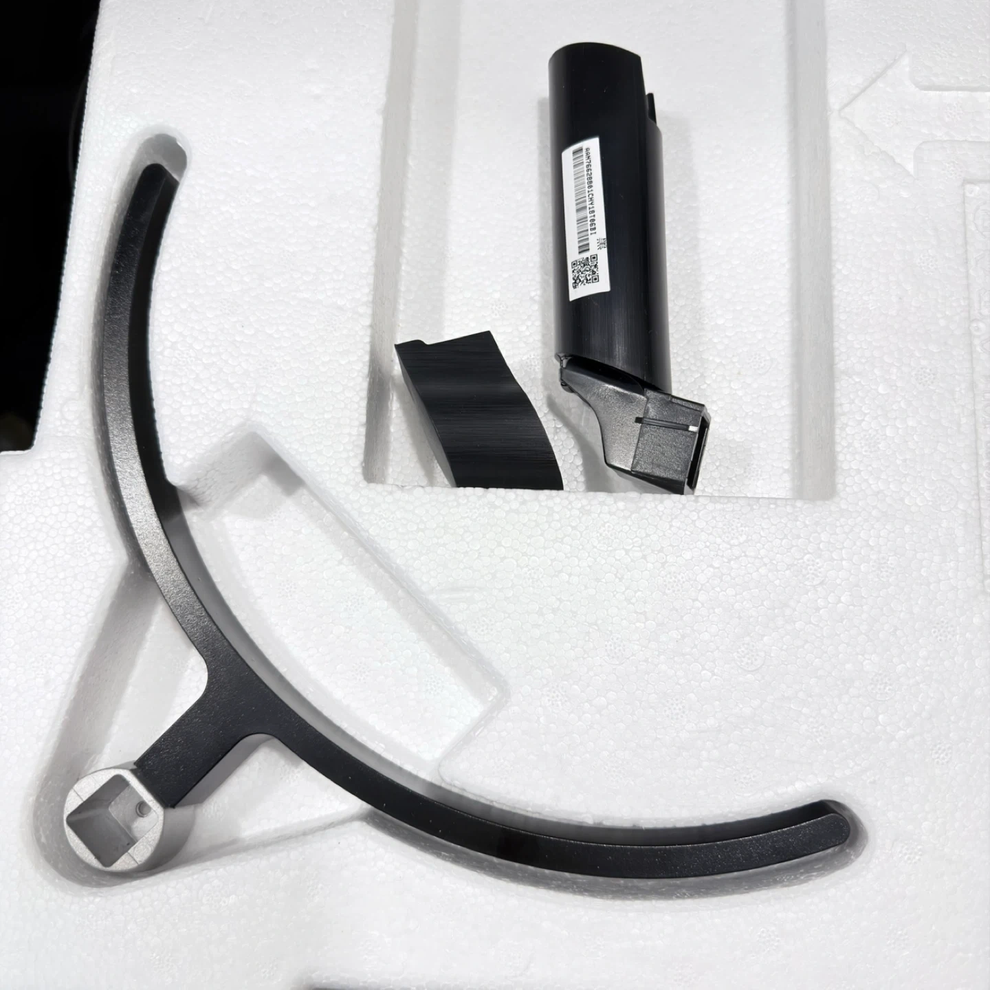 Includes a monitor stand base and a vertical mount piece. These are black metal components. They're designed for specific monitor models. The parts come as shown in the protective styrofoam packaging.