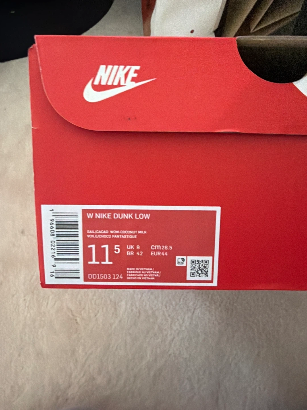 W Nike Dunk Low in Sail/Coconut Milk/Velvet Brown. This pair is a US Women's size 11.5 (UK 9, CM 28.5, EUR 44). = men’s size 10 Includes original box.
