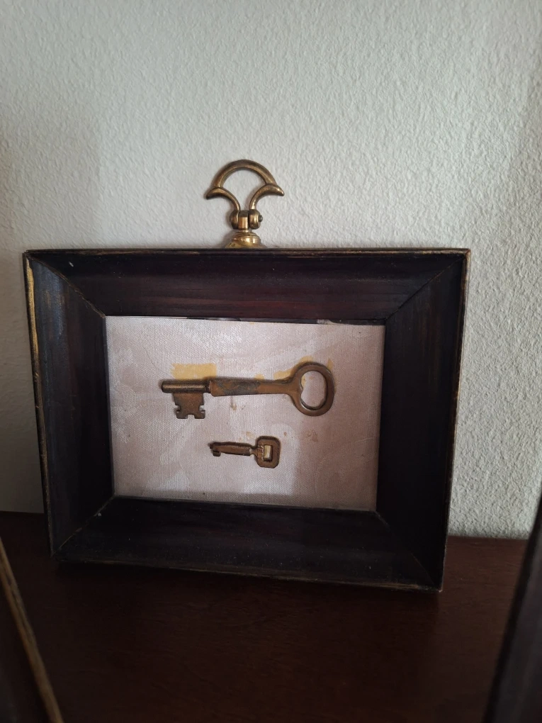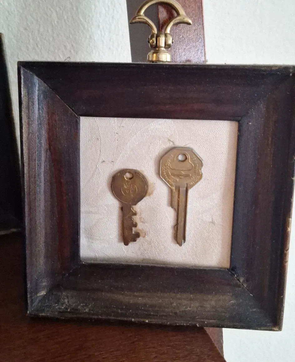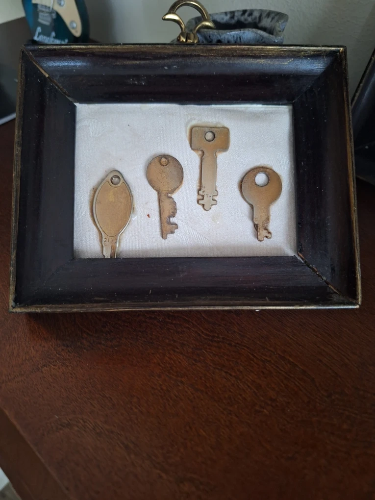 This is a framed display of vintage keys. It's mounted on a patterned fabric inside a dark wooden frame. A decorative brass hook is attached at the top for hanging.