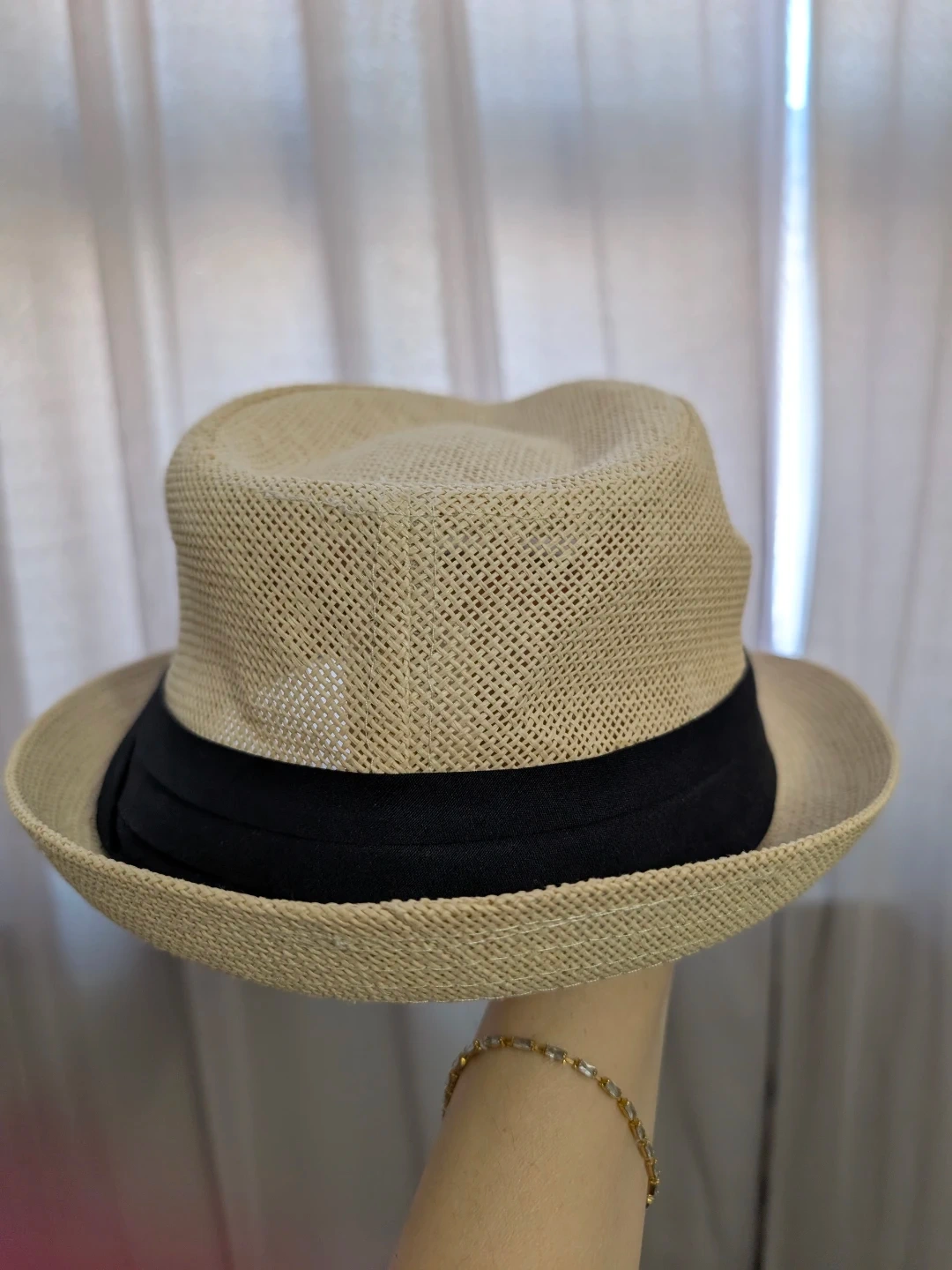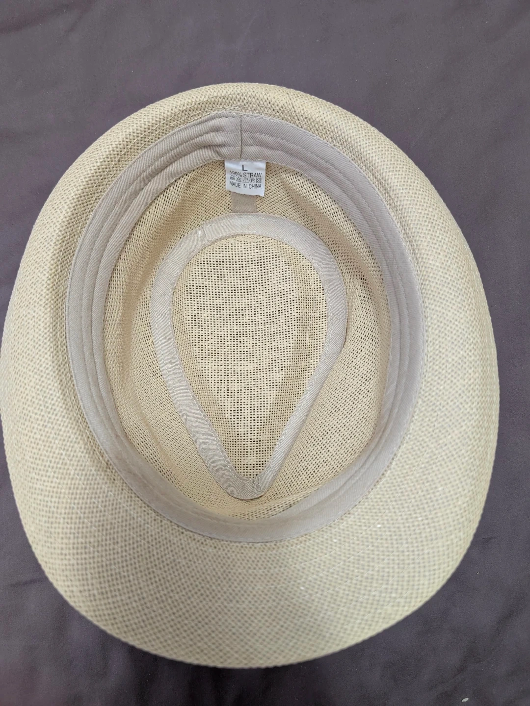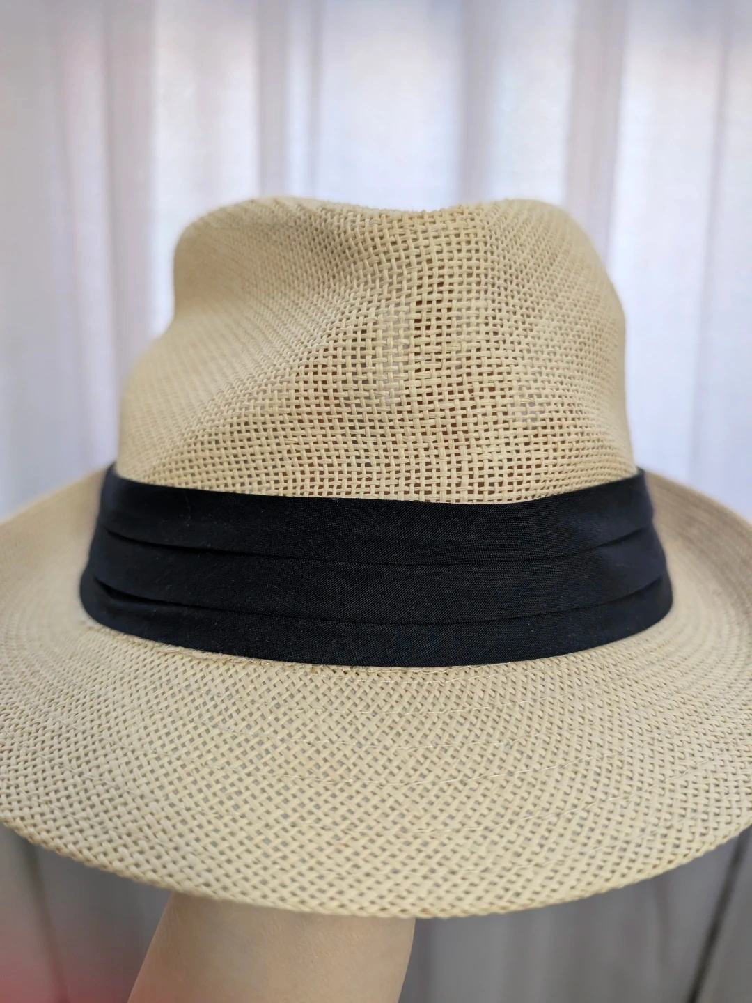 Classic straw fedora hat with a black grosgrain ribbon band. It's a size L, perfect for staying cool and stylish on sunny days. Made of 100% straw, it offers great breathability.