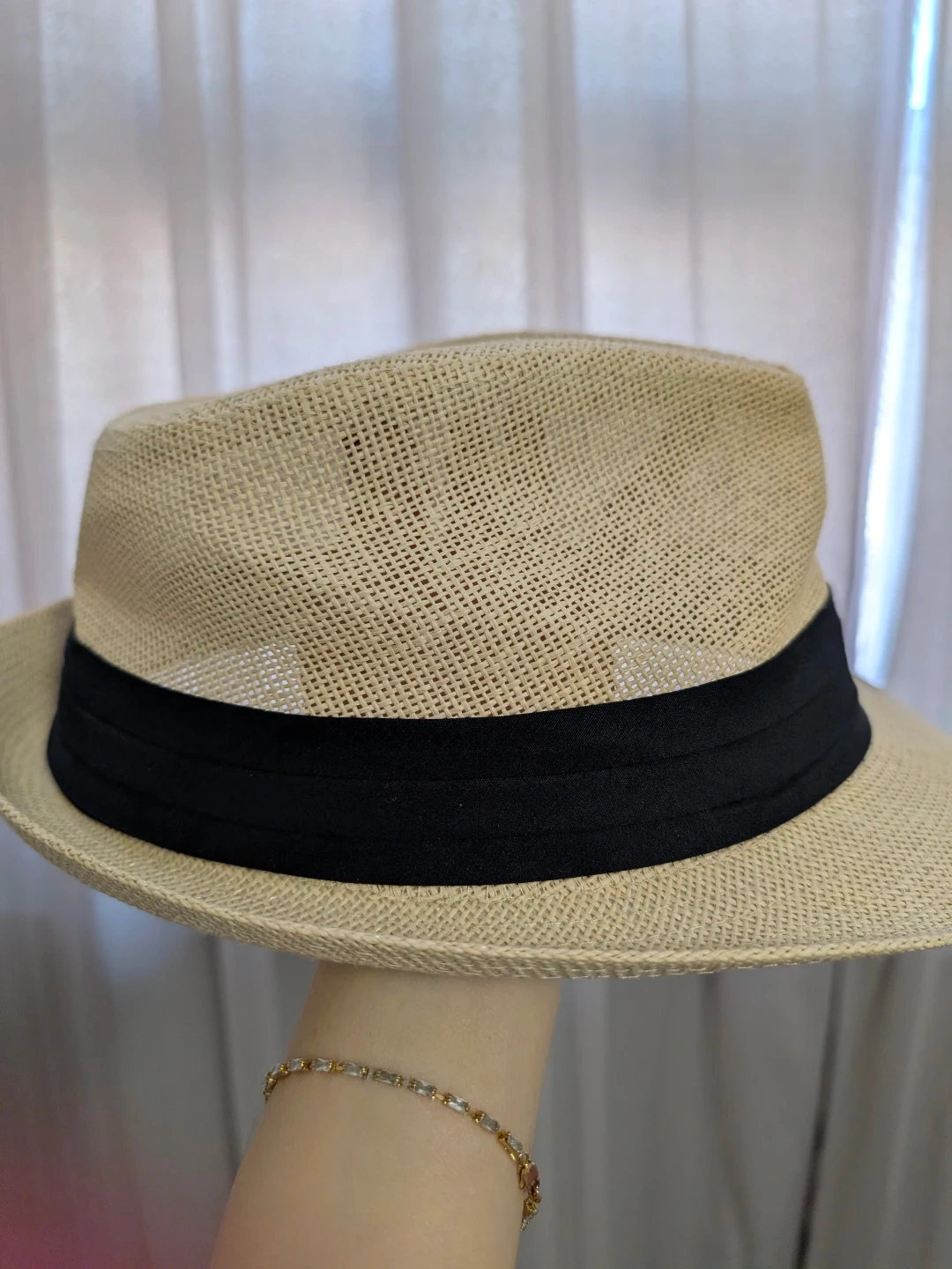 Classic straw fedora hat with a black grosgrain ribbon band. It's a size L, perfect for staying cool and stylish on sunny days. Made of 100% straw, it offers great breathability.
