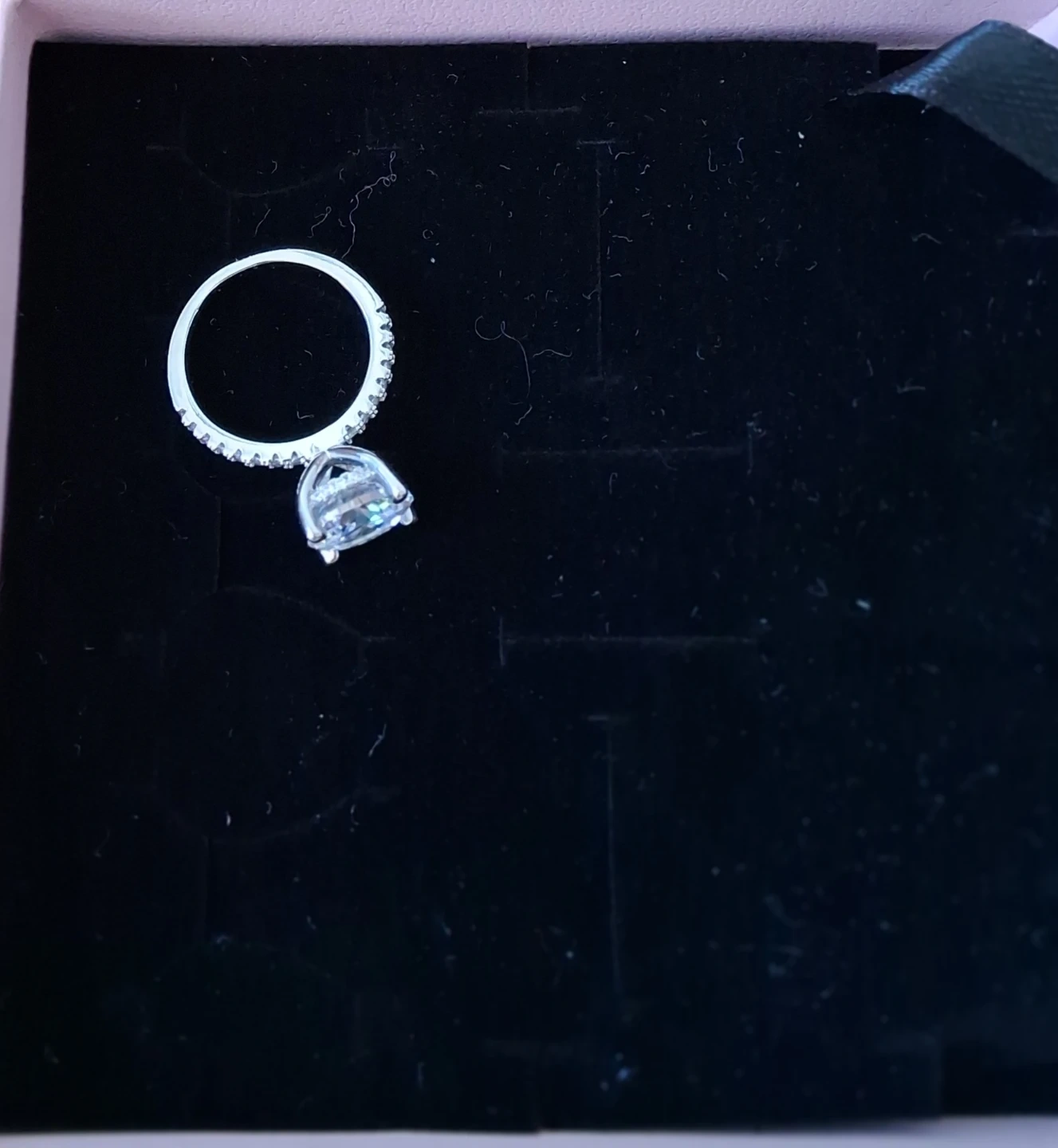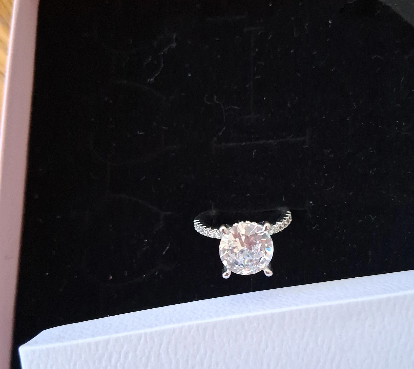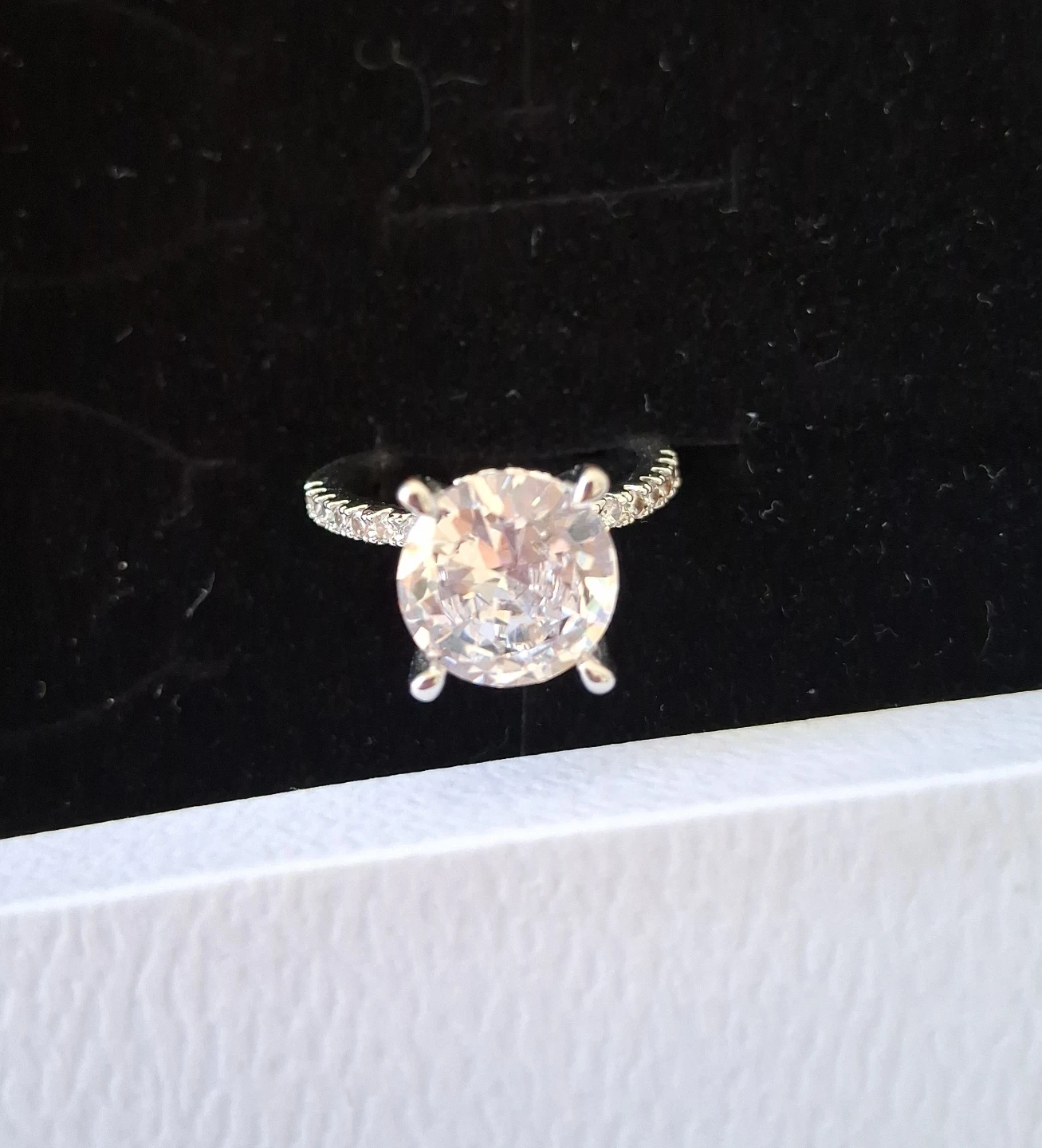 This ring features a band with small accent stones and a prominent large center stone. It's set in a silver-toned metal. Perfect for adding a touch of sparkle to any outfit!