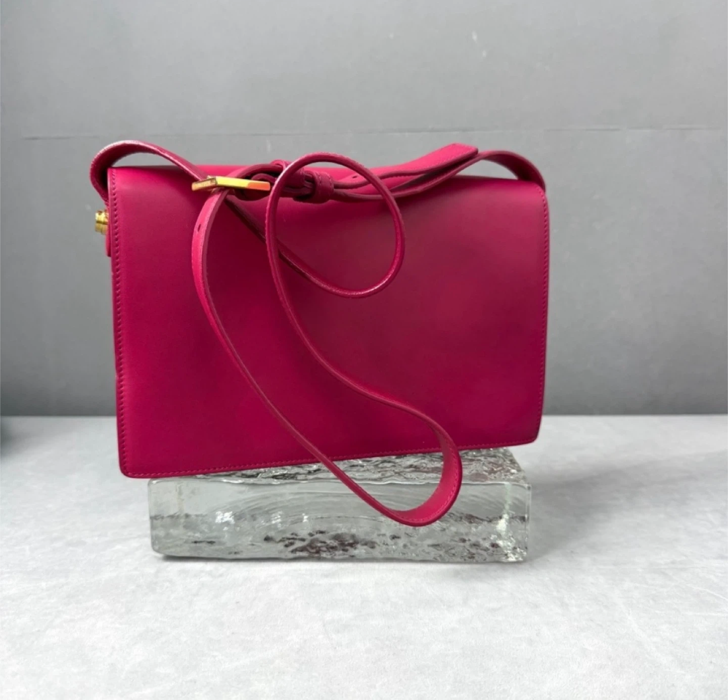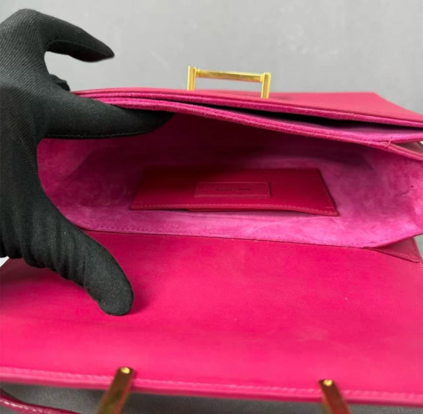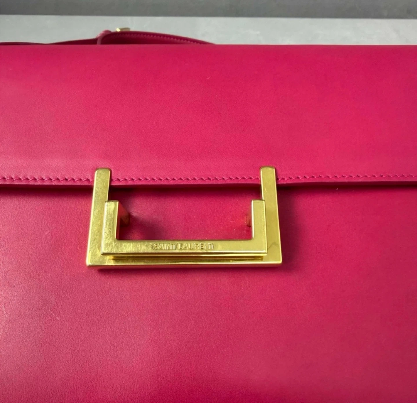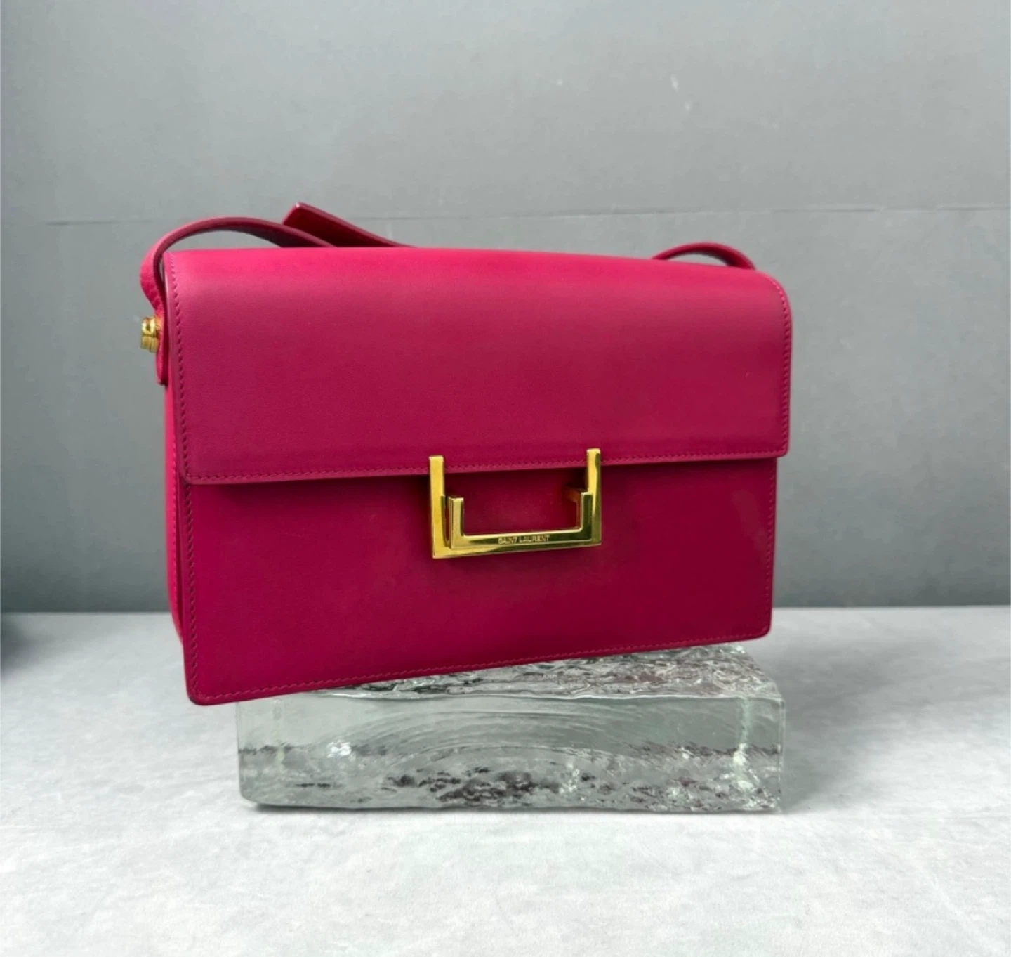 A beautiful Saint Laurent Solferino bag in a striking fuchsia colour! The bag features a gold-tone metal YSL closure, adding a touch of luxury. It's a stylish and compact accessory, perfect for adding a pop of colour to any outfit