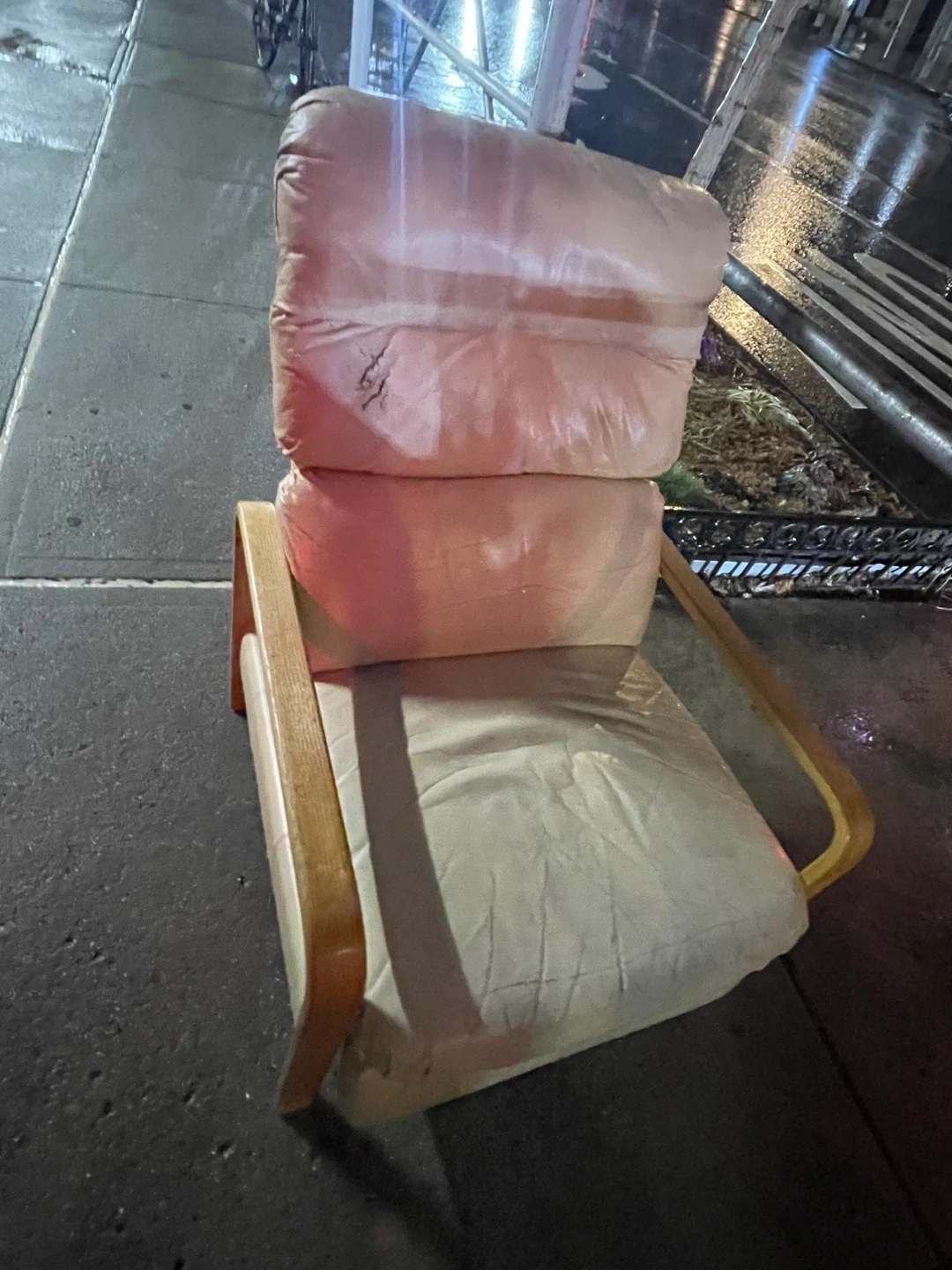 This cream leather armchair features a bentwood frame. It has a padded seat and backrest for comfort. There's a small tear on the backrest.