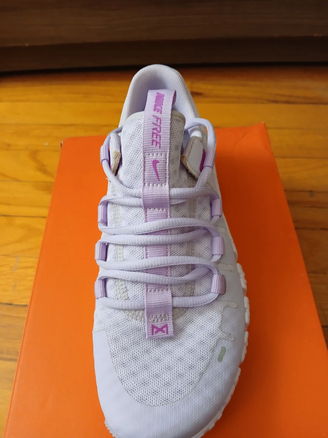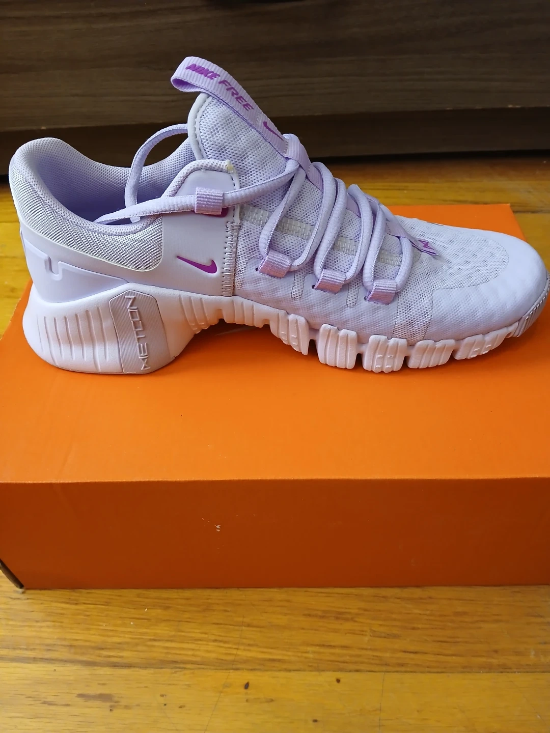These Nike Free Metcon shoes are lavender with purple accents. They come with the original box.