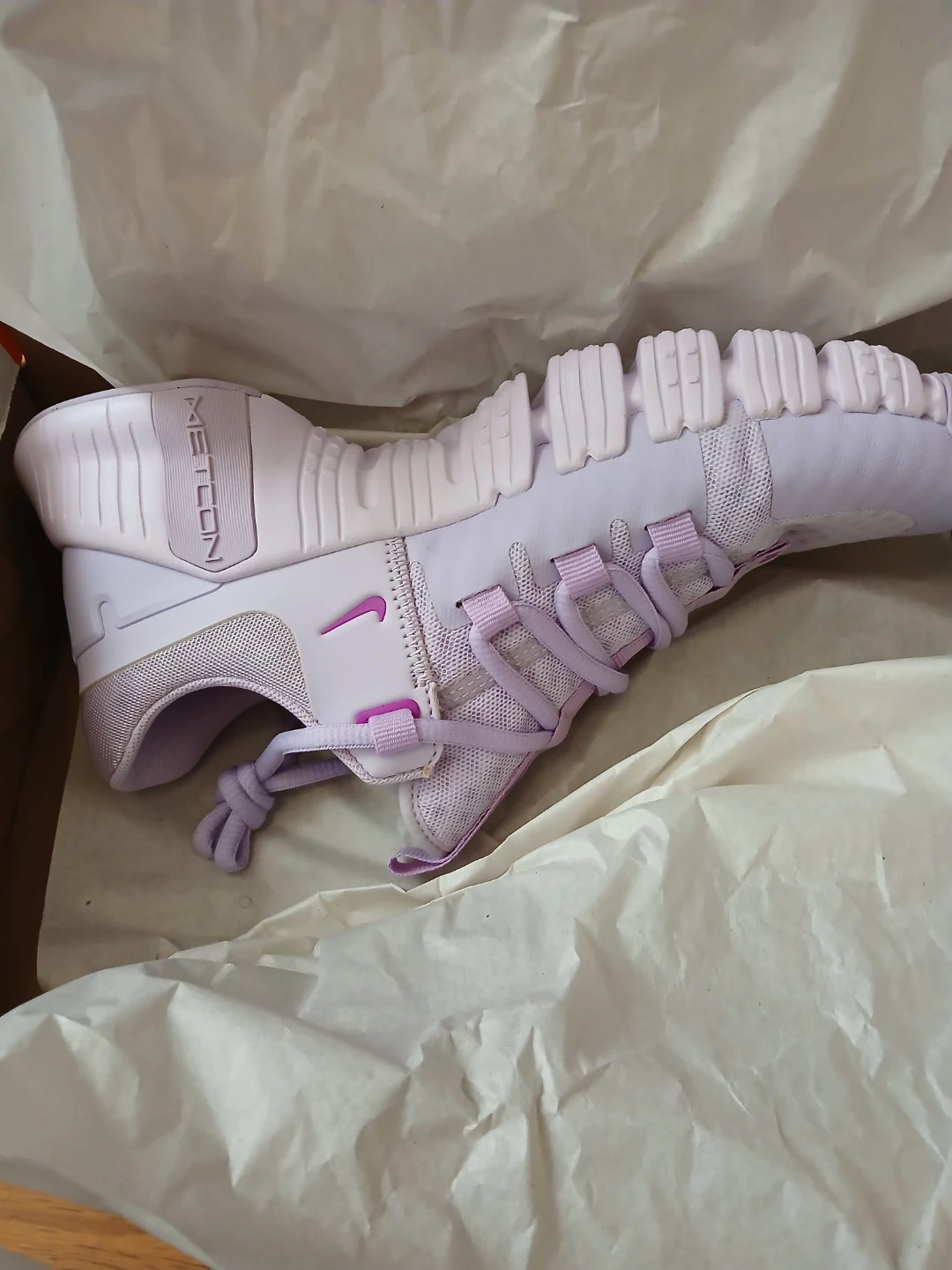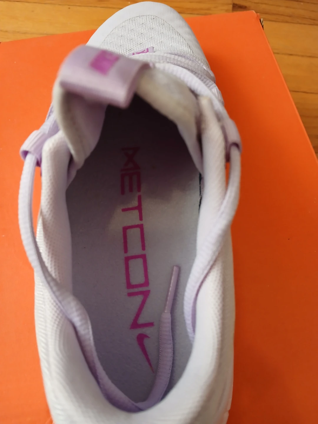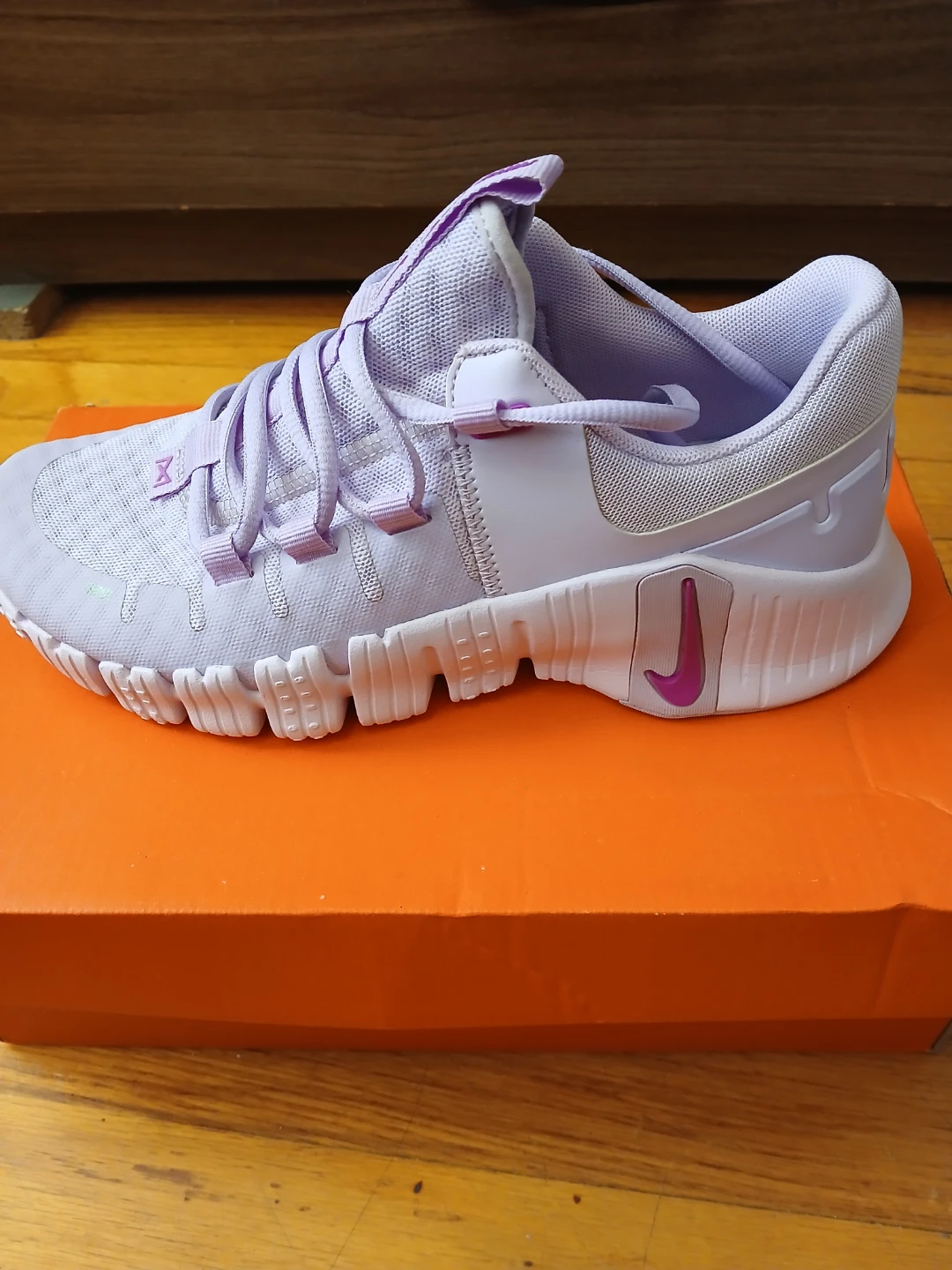 These Nike Free Metcon shoes are lavender with purple accents. They come with the original box.