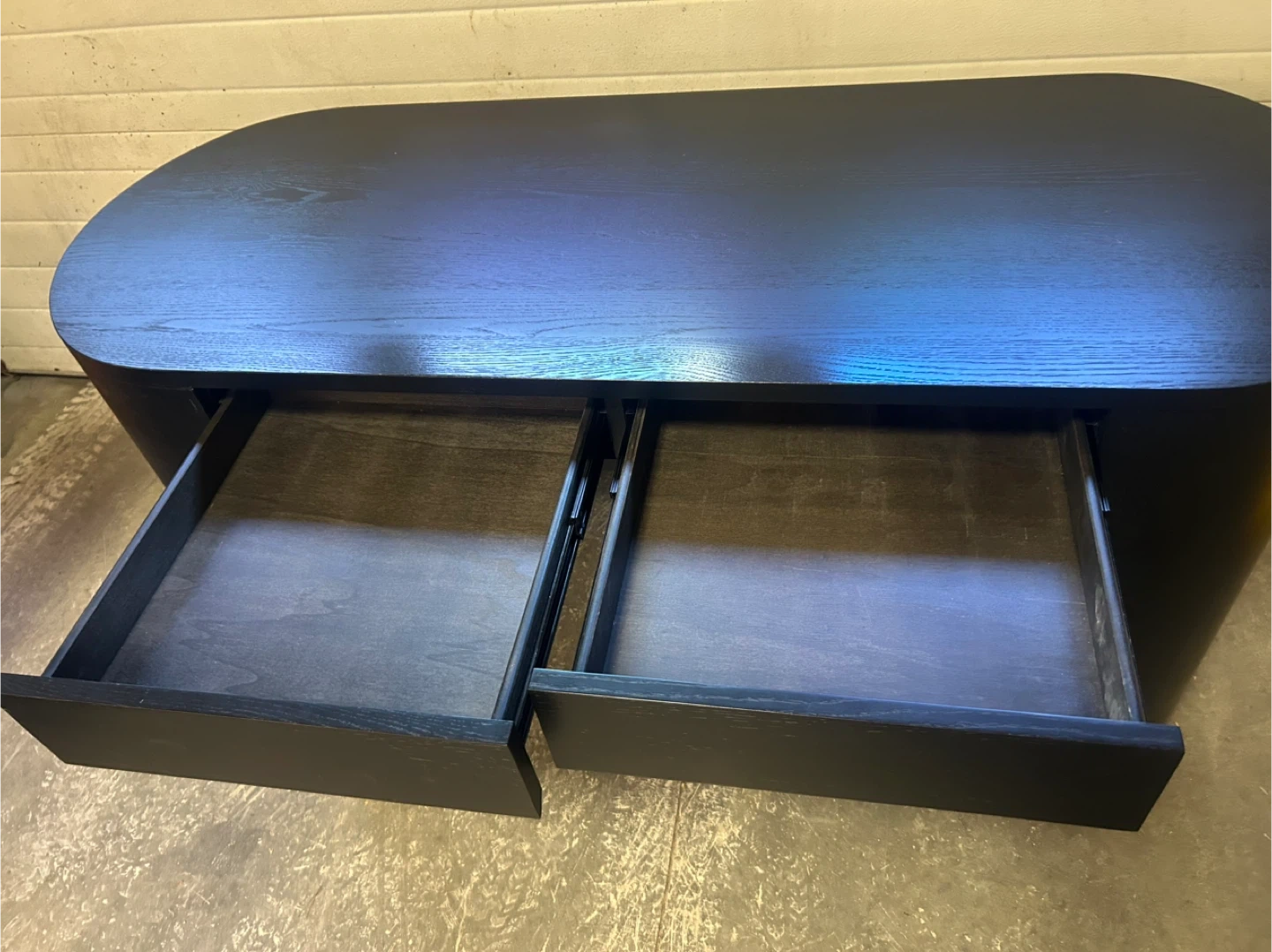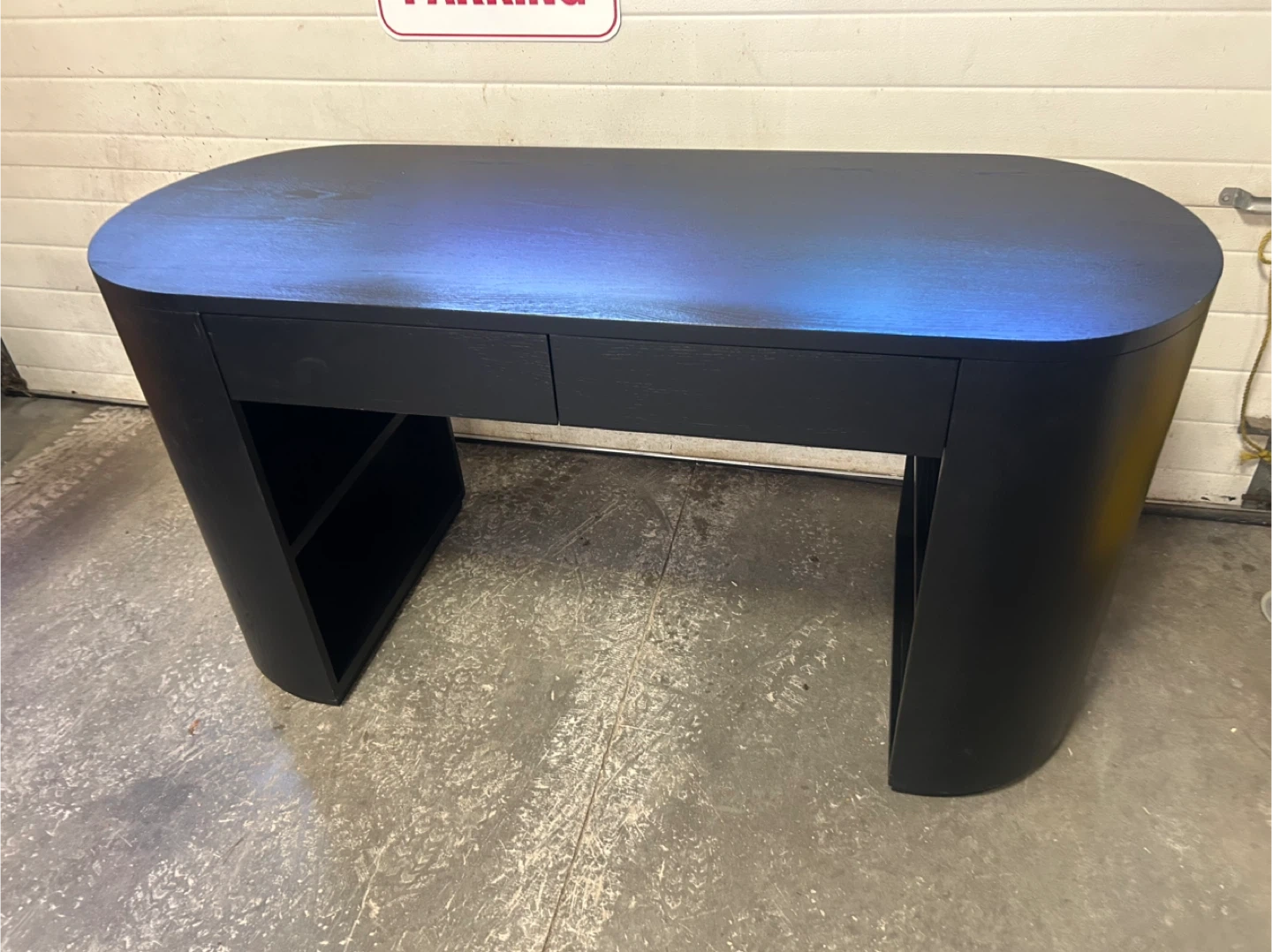 A black wood Pilar desk with two drawers and open shelving. It's a modern, curved design. This desk is good for a home office setup.
