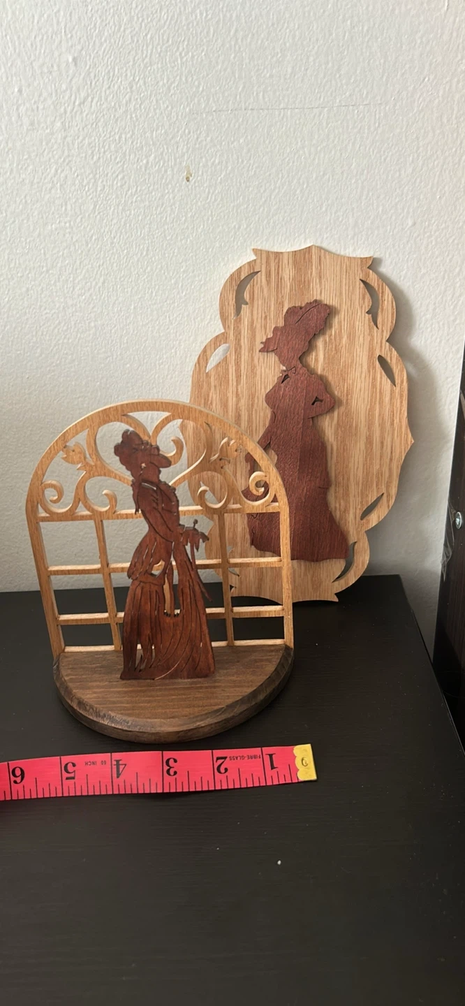 Two wooden silhouette decorative pieces featuring figures in vintage attire. One is a freestanding piece with an arched window frame, and the other is a flat plaque. Both are crafted from light and dark wood.