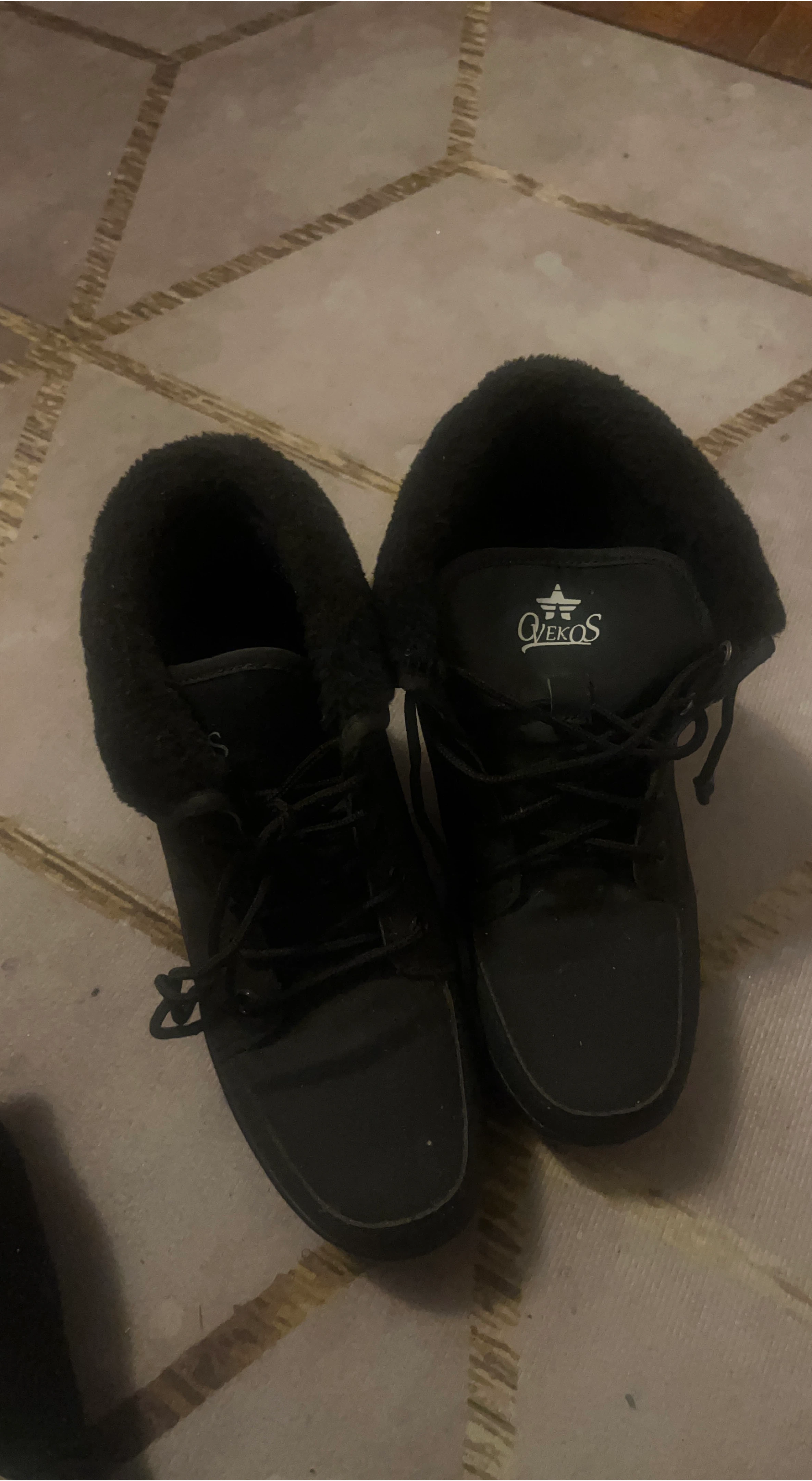 Selling a pair of QVEKOS winter boots in black. They have a cozy, fur-like lining around the top. Great for keeping your feet warm and stylish during the colder months!