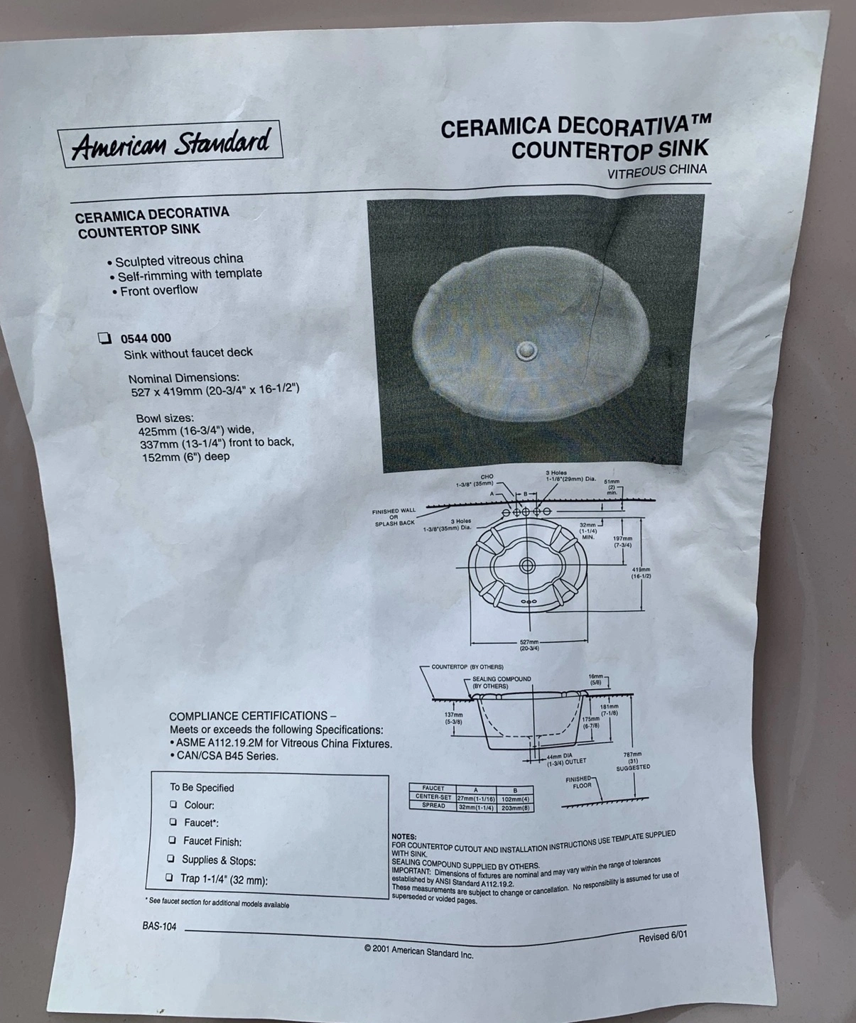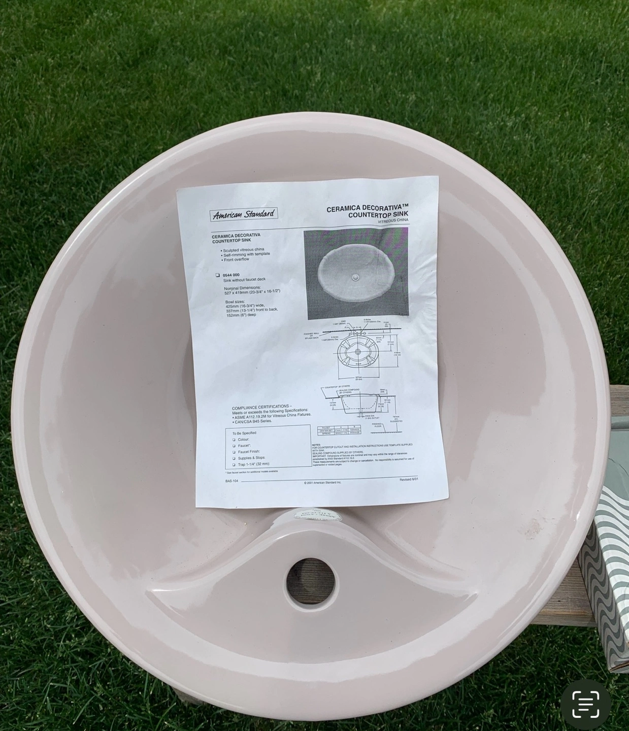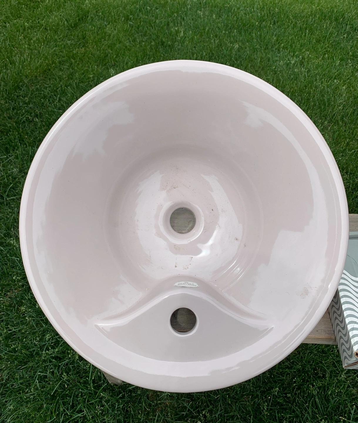 Round countertop sink. Sculpted vitreous china. Includes overflow. Pale pink colour. Measurements provided in images.