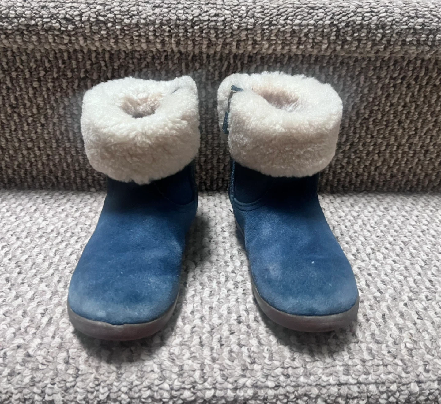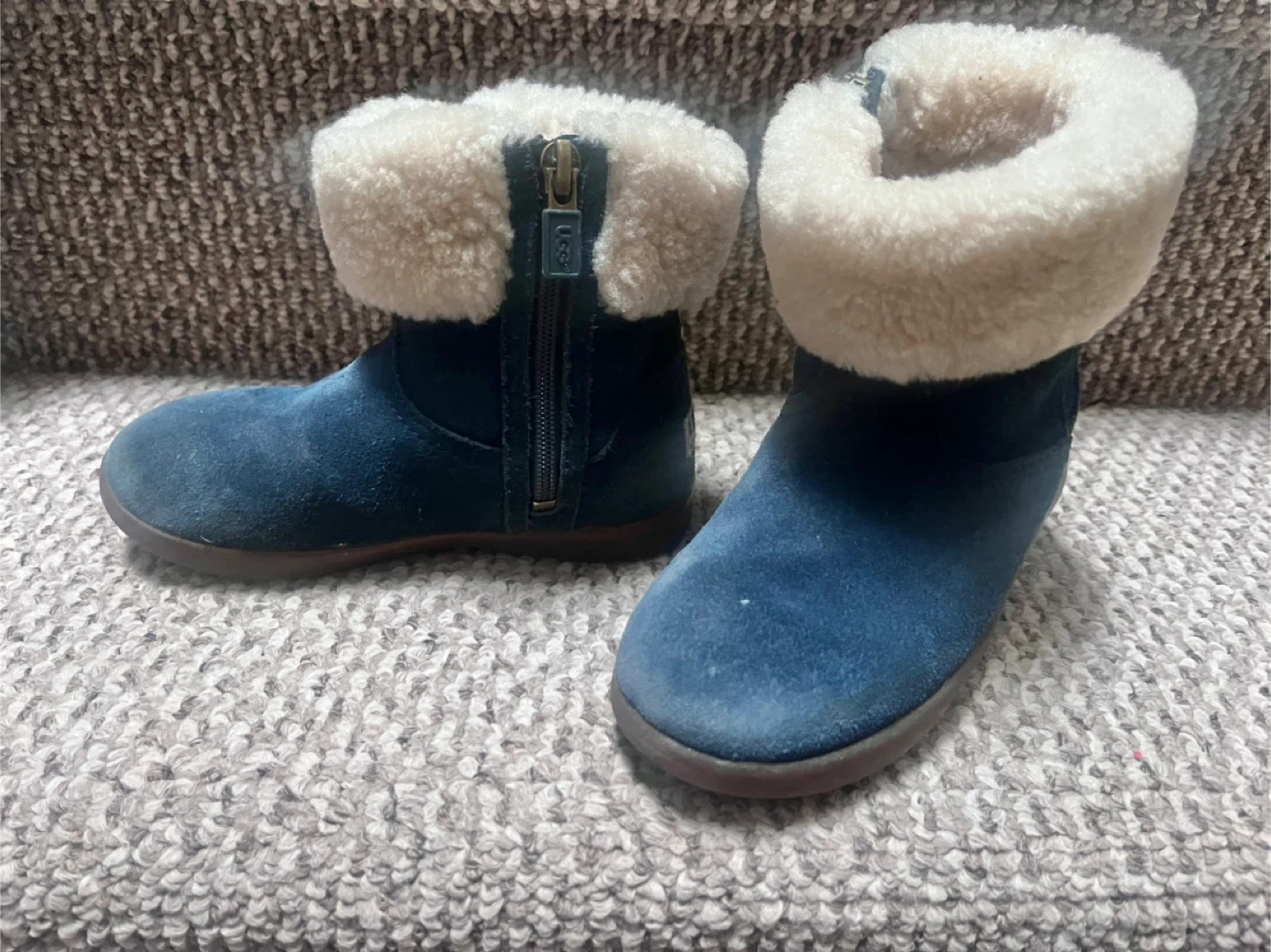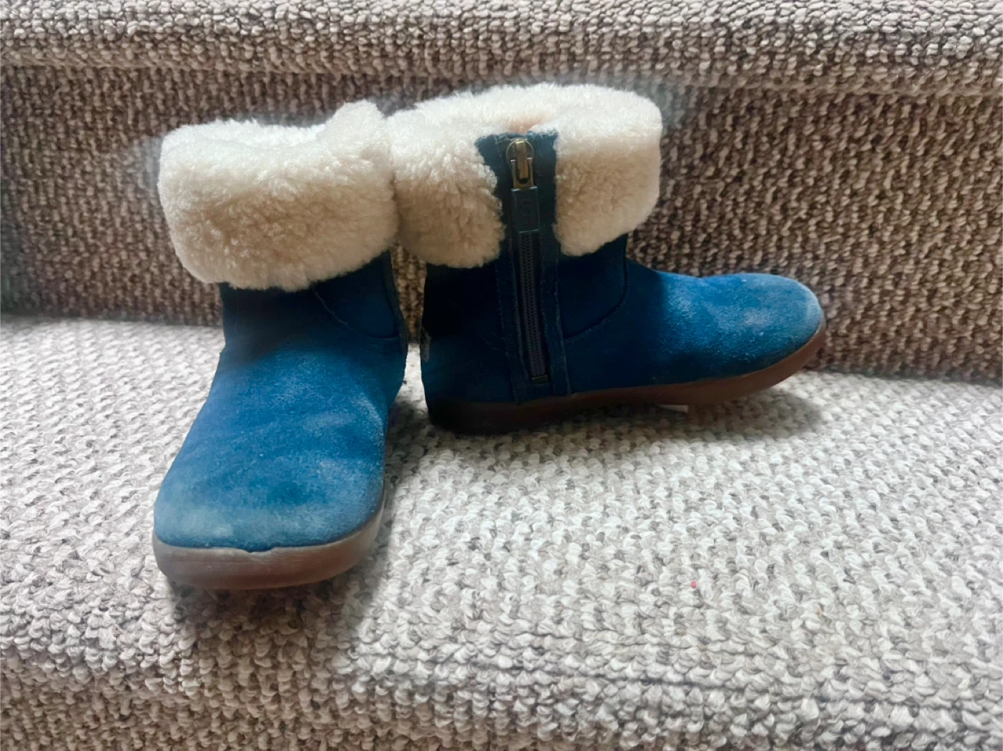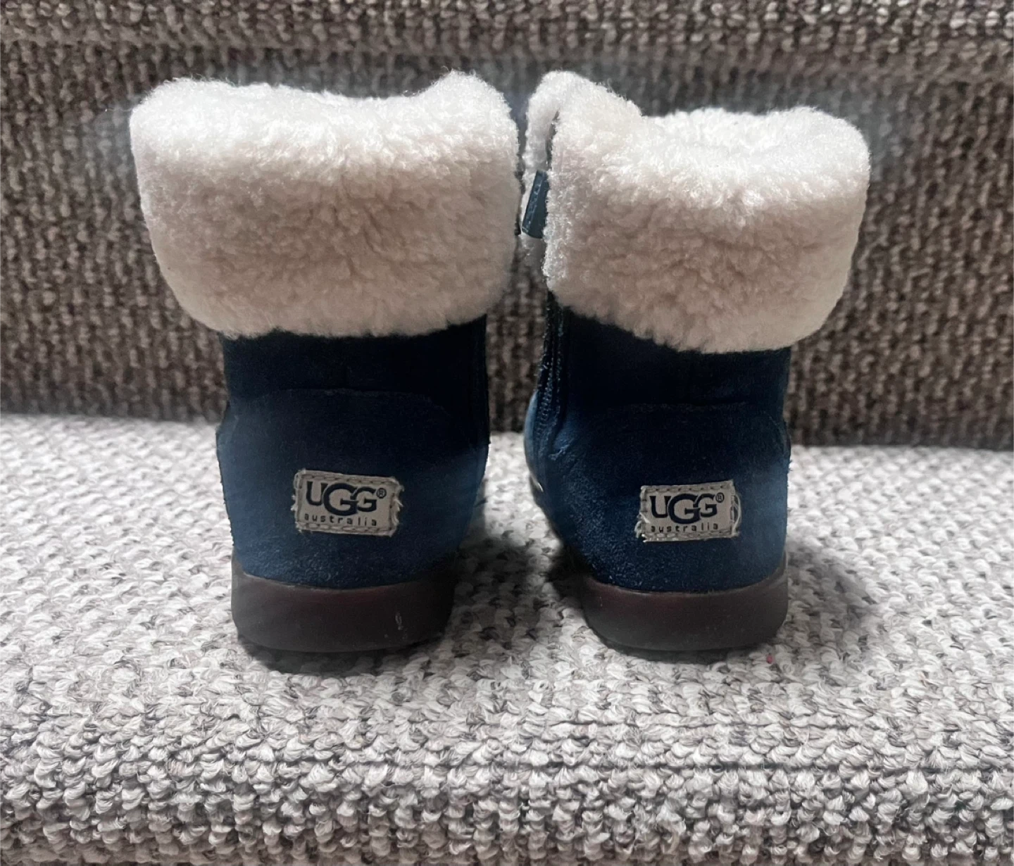 These UGG Australia boots are a deep blue colour and lined with fluffy sheepskin. They have a side zipper for easy on and off. Suede exterior material.