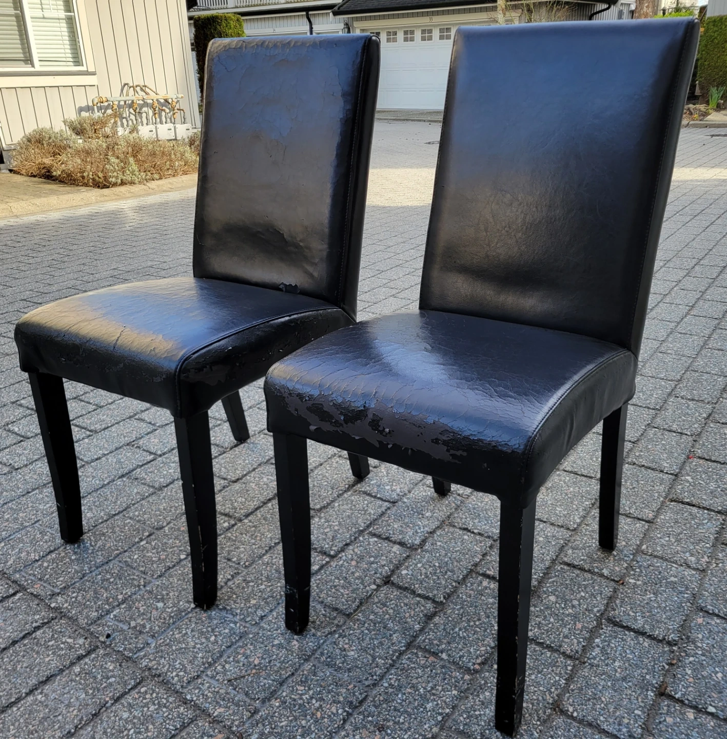 A set of two black dining chairs. Upholstery shows wear and peeling in areas. Sturdy wooden frames. These chairs would be good for a dining room or kitchen space. Let me know if you are interested. Thanks. $10 Each.