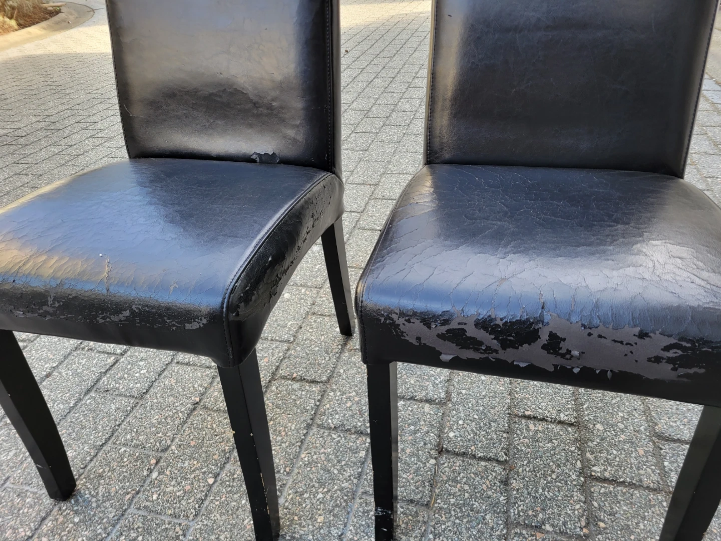 A set of two black dining chairs. Upholstery shows wear and peeling in areas. Sturdy wooden frames. These chairs would be good for a dining room or kitchen space. Let me know if you are interested. Thanks. $10 Each.