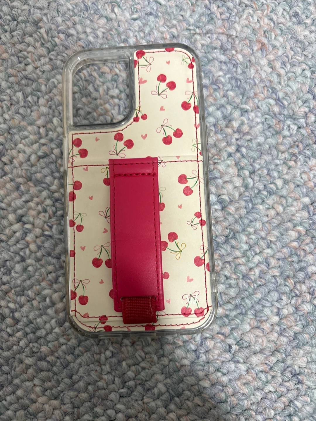 Cute phone case with a repeating cherry and heart pattern. It features a pink leather grip strap on the back. Clear plastic construction provides protection iPhone 16 case . Pick up cash only