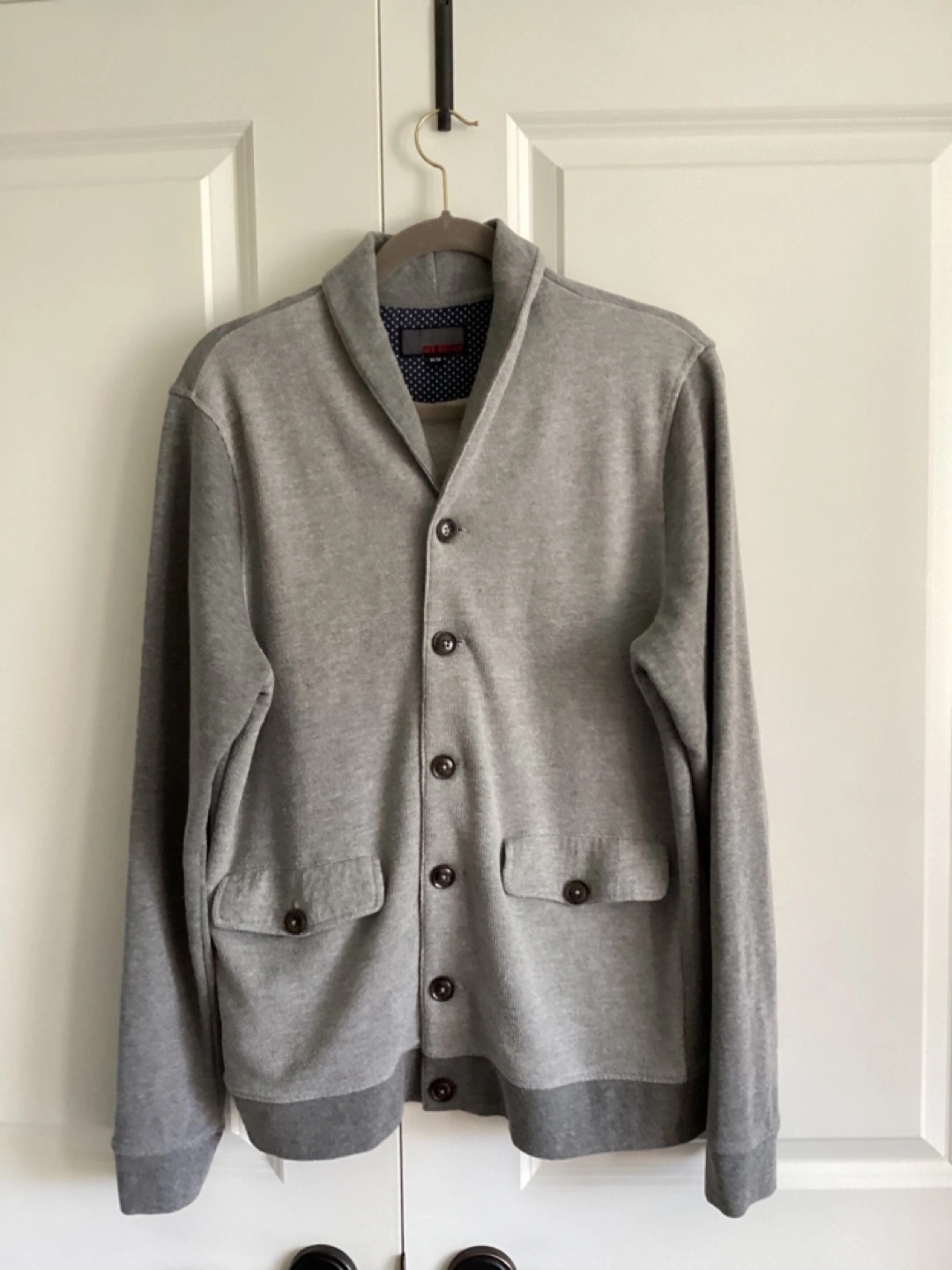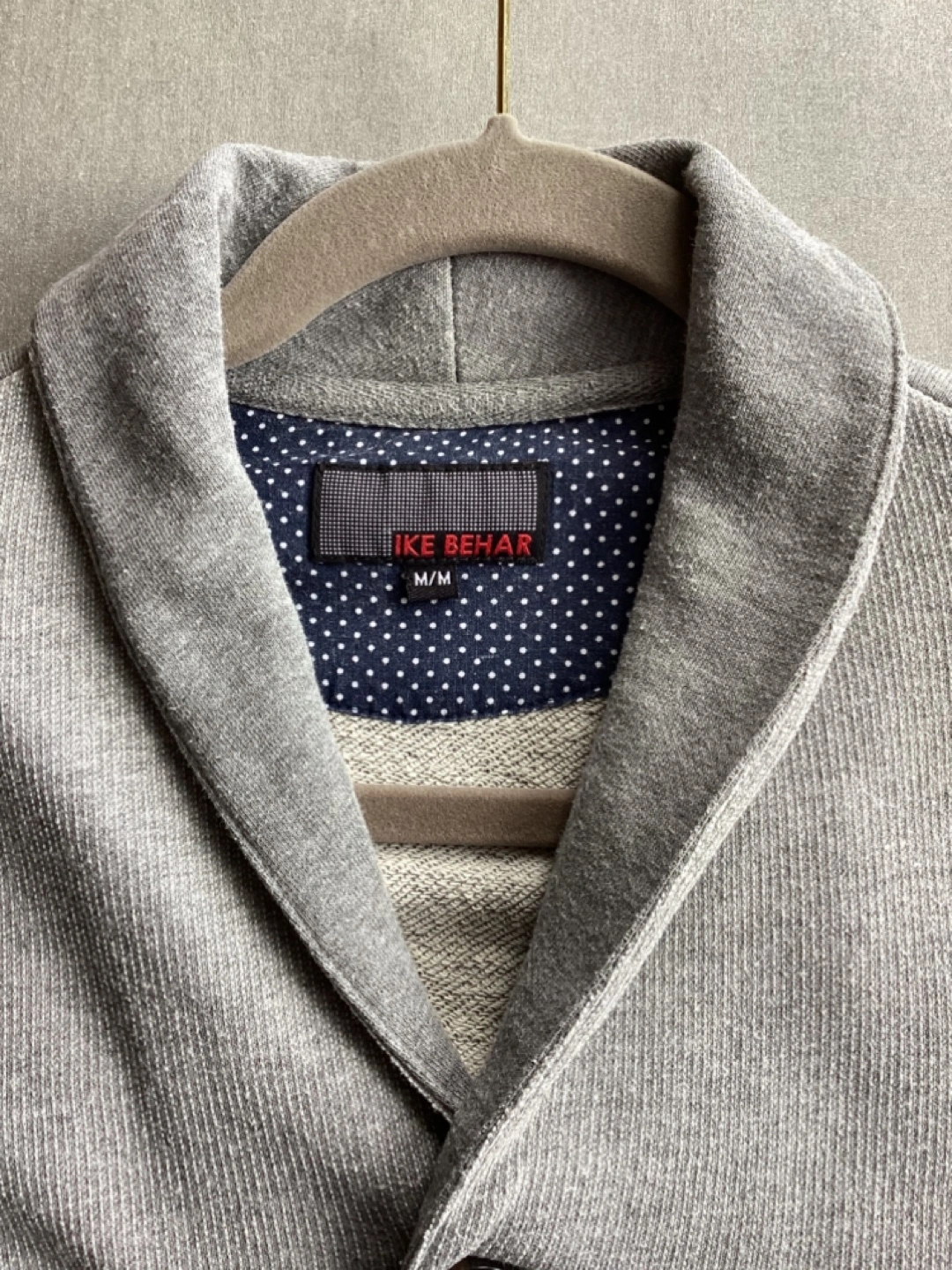 Ike Behar Mens Fleece Cardigan, it is labelled Medium but I would say it is more like a Large, it is quite long so it is well suited to a tall man, some signs of wear, very comfortable to wear, $10 or best offer.