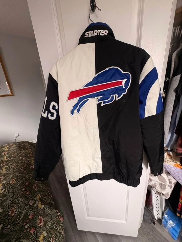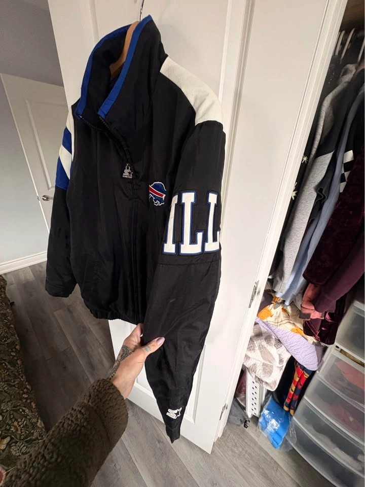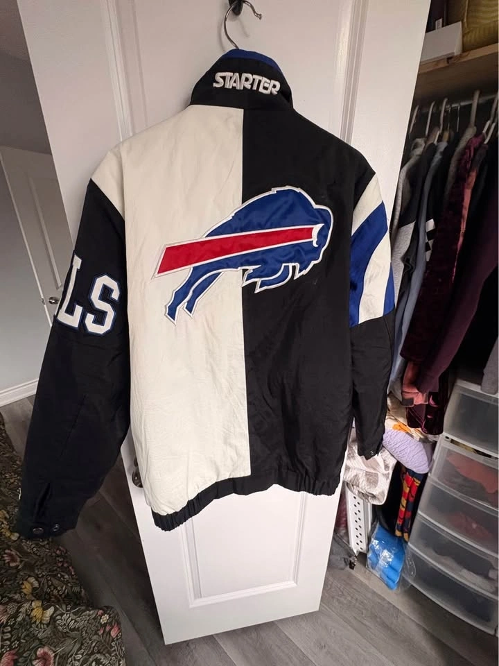 Buffalo Bills Starter Brand Varsity Winter Jacket. Men's medium. Great condition. No stains or rips. Zipper pocket inside jacket. Pickup in Brantford. Cat friendly home. No holds. Crossposted.