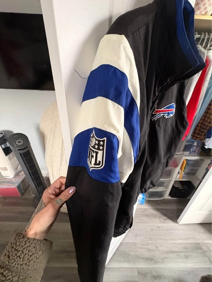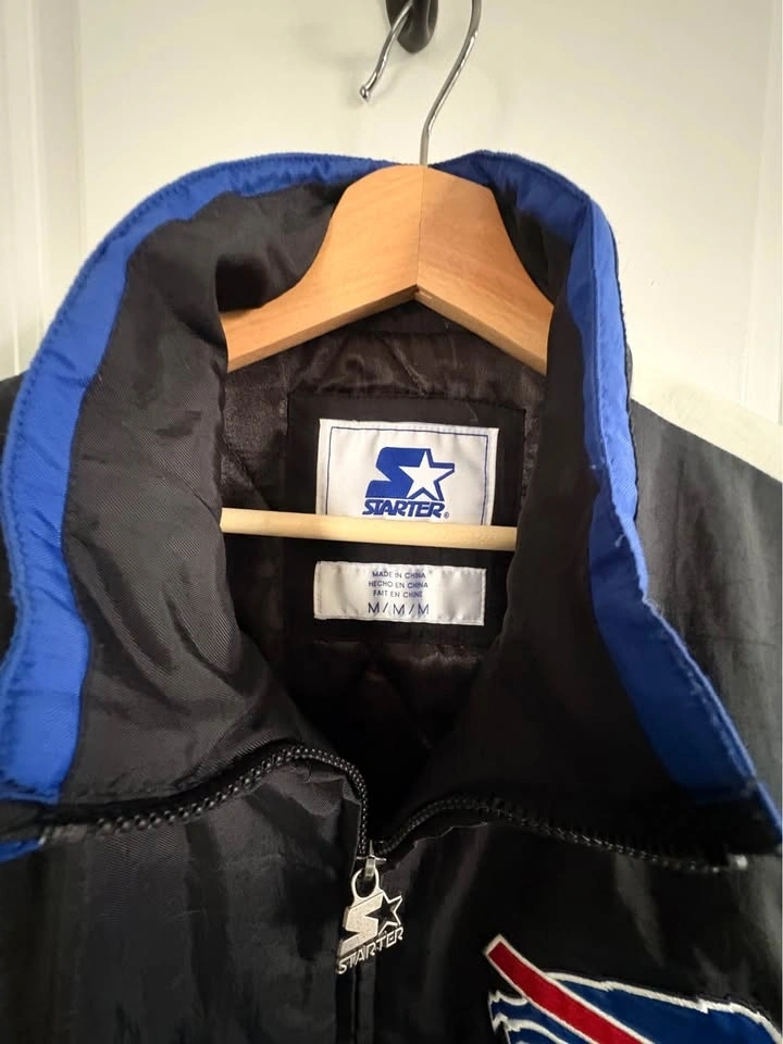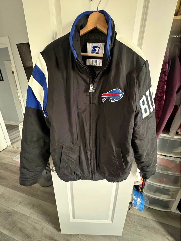 Buffalo Bills Starter Brand Varsity Winter Jacket. Men's medium. Great condition. No stains or rips. Zipper pocket inside jacket. Pickup in Brantford. Cat friendly home. No holds. Crossposted.