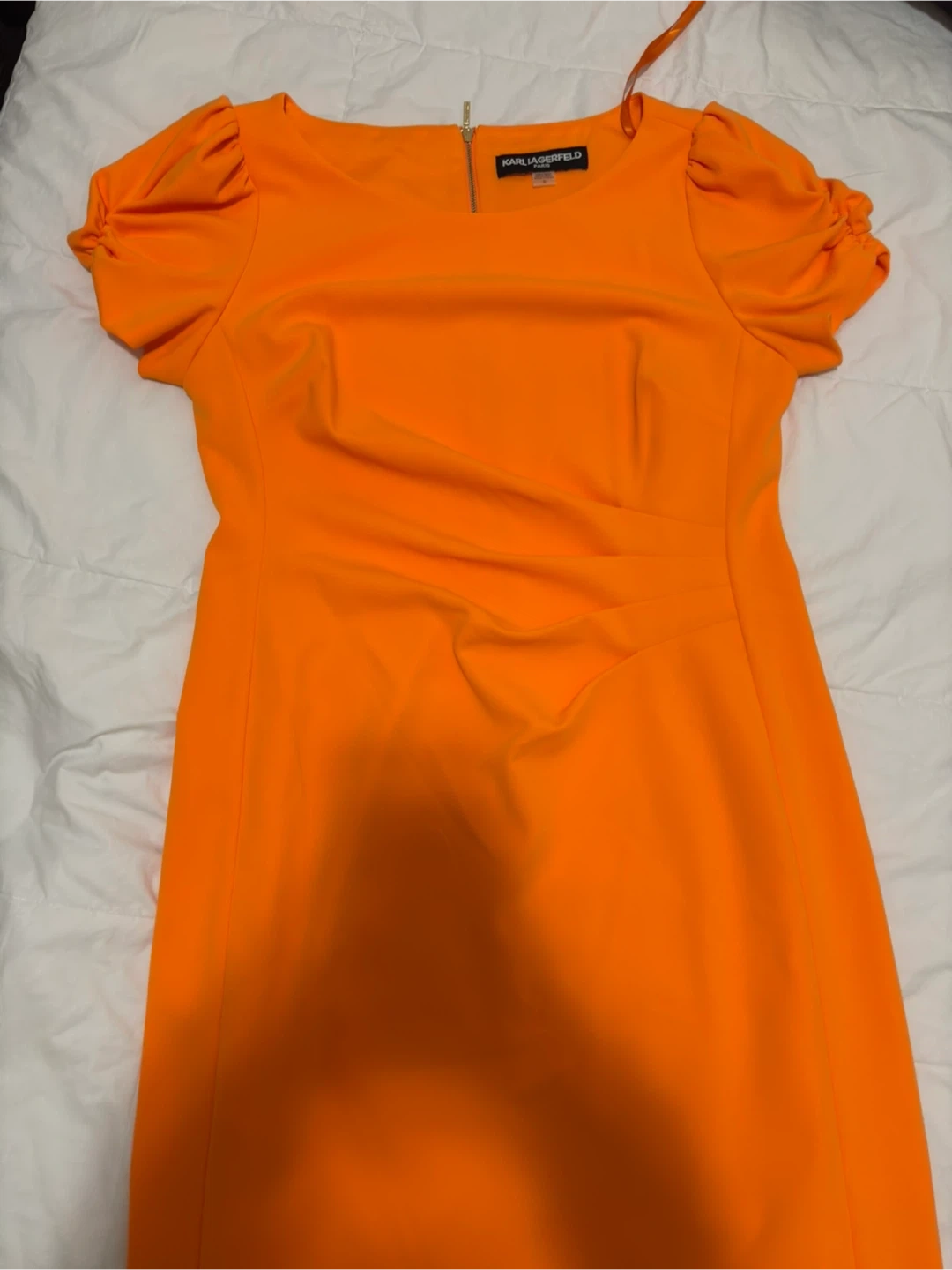 Selling a vibrant orange dress from Karl Lagerfeld! It's in great condition and ready for a new home. The dress features a stylish design and would be a fantastic addition to your wardrobe