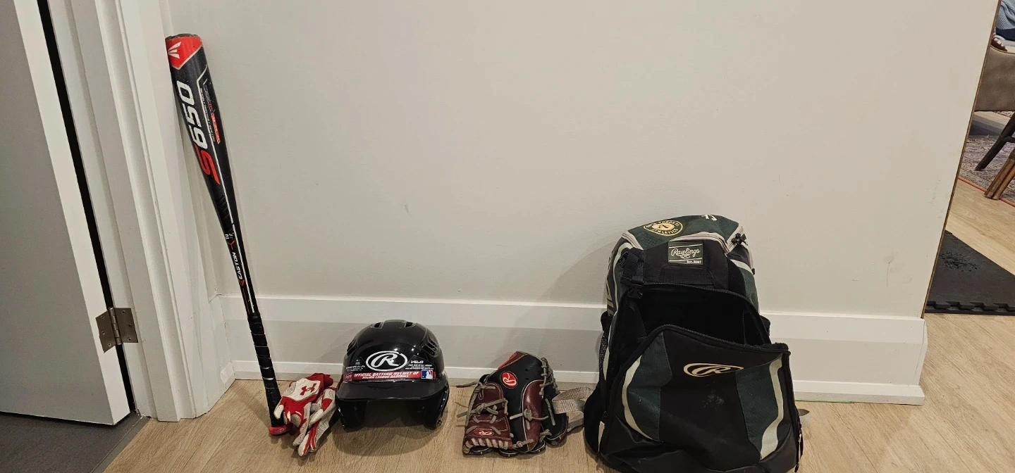 Baseball equipment Bat Easton S650, Glove, Helmet and bag