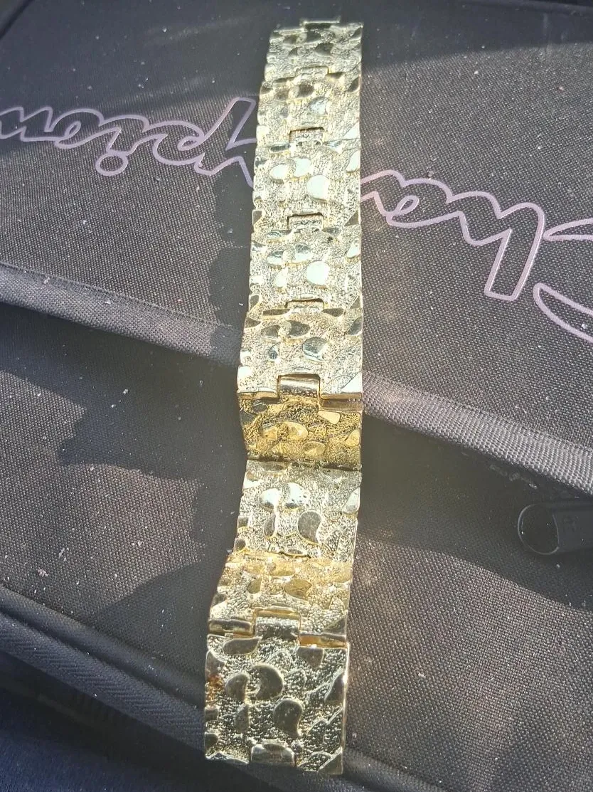 This is a gold-tone bracelet with a unique nugget texture. It features a sturdy clasp closure for a secure fit. Its bold design makes it a statement piece for any jewelry collection.
