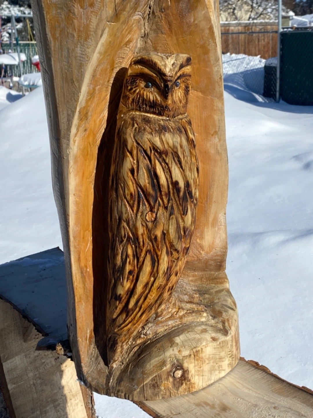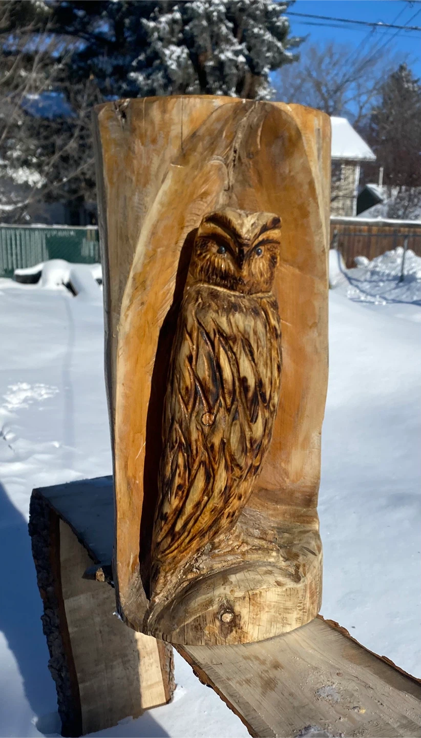 Hand-carved wooden owl sculpture