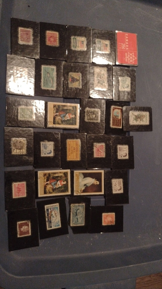 28 stamps, mostly cancelled. All are individually secured to a 1/8 inch backing hardboard. Cash accepted. Feel free to message if you have any questions!