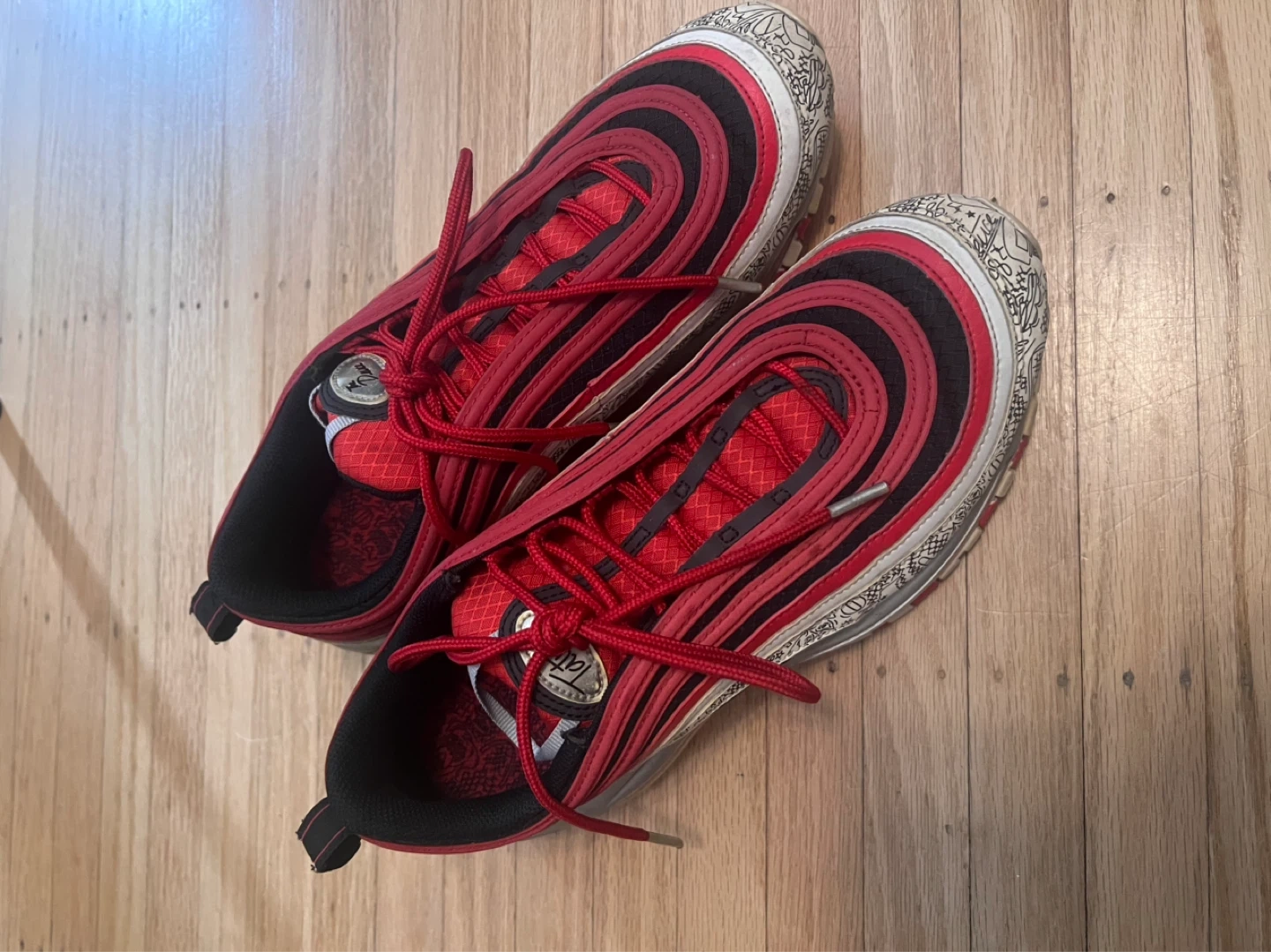 These are Nike Air Max 97 sneakers in a red and black colourway. They feature the iconic Air Max cushioning. They're a stylish pair for everyday wear.
