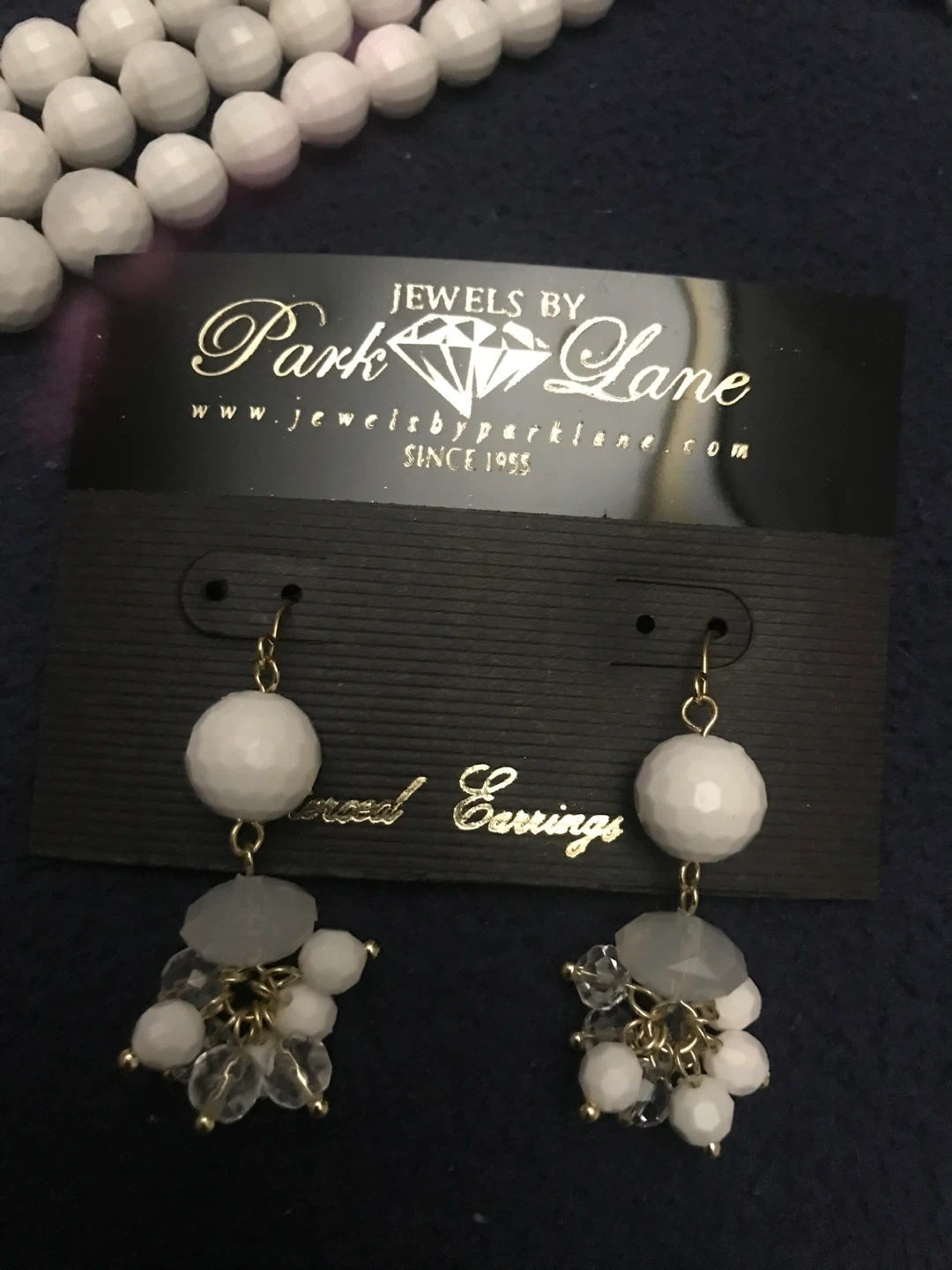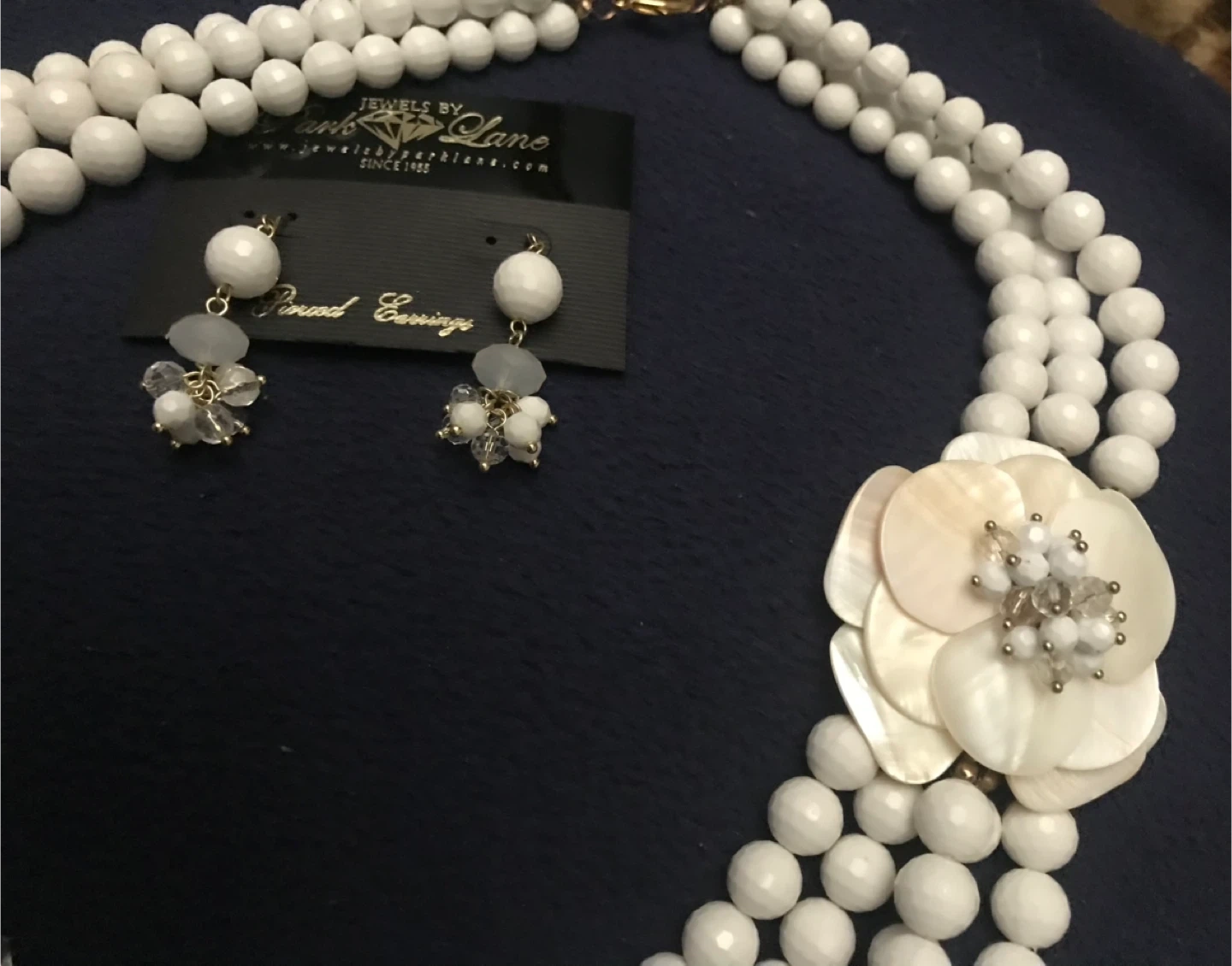 Lot 1 - Beautiful white beaded necklace and earrings set from Park Lane! The necklace features multiple strands of white beads and a flower-shaped accents. The earrings are a matching design with white beads and crystal accents. Comes with black velvet pouch. Perfect for adding a touch of elegance to any outfit. Asking $25 for the set.