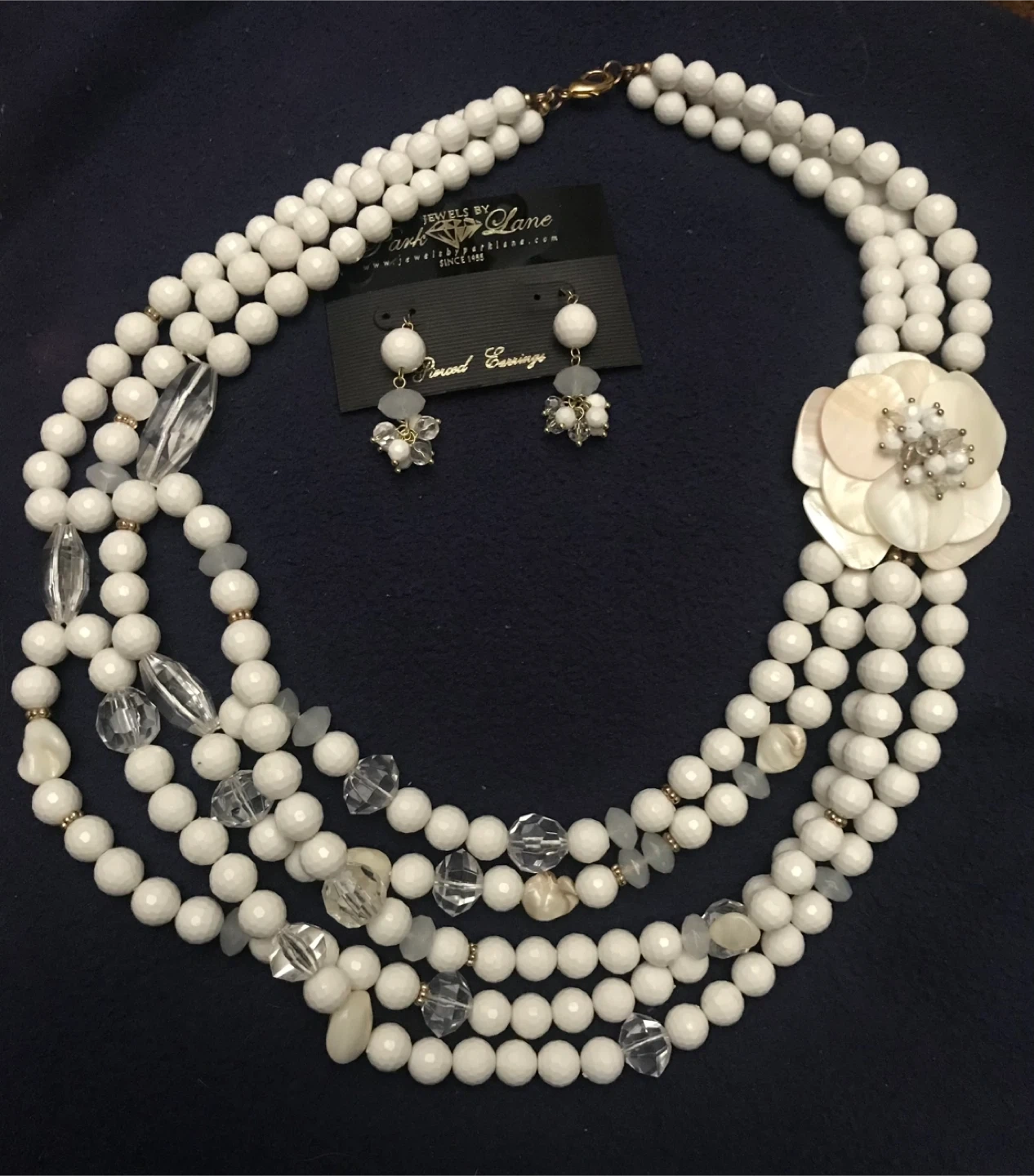 Lot 1 - Beautiful white beaded necklace and earrings set from Park Lane! The necklace features multiple strands of white beads and a flower-shaped accents. The earrings are a matching design with white beads and crystal accents. Comes with black velvet pouch. Perfect for adding a touch of elegance to any outfit. Asking $25 for the set.