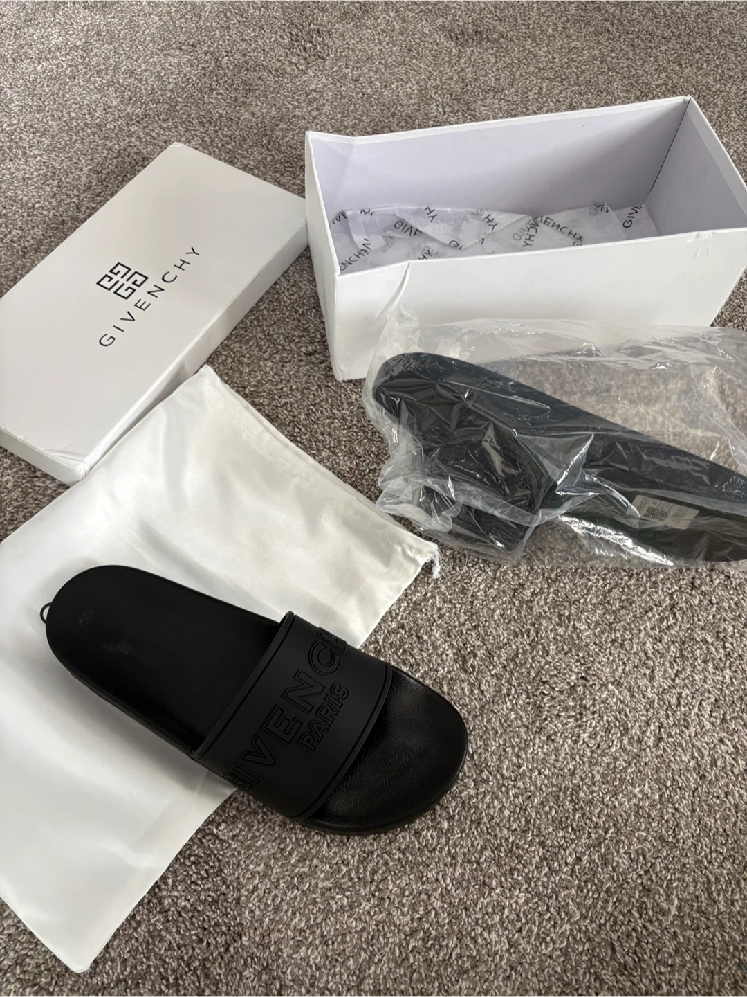 Black Givenchy slide sandals. Comes with original box, dust bag, and packaging paper. These are a stylish and comfortable choice for warm weather. Made with durable rubber.
