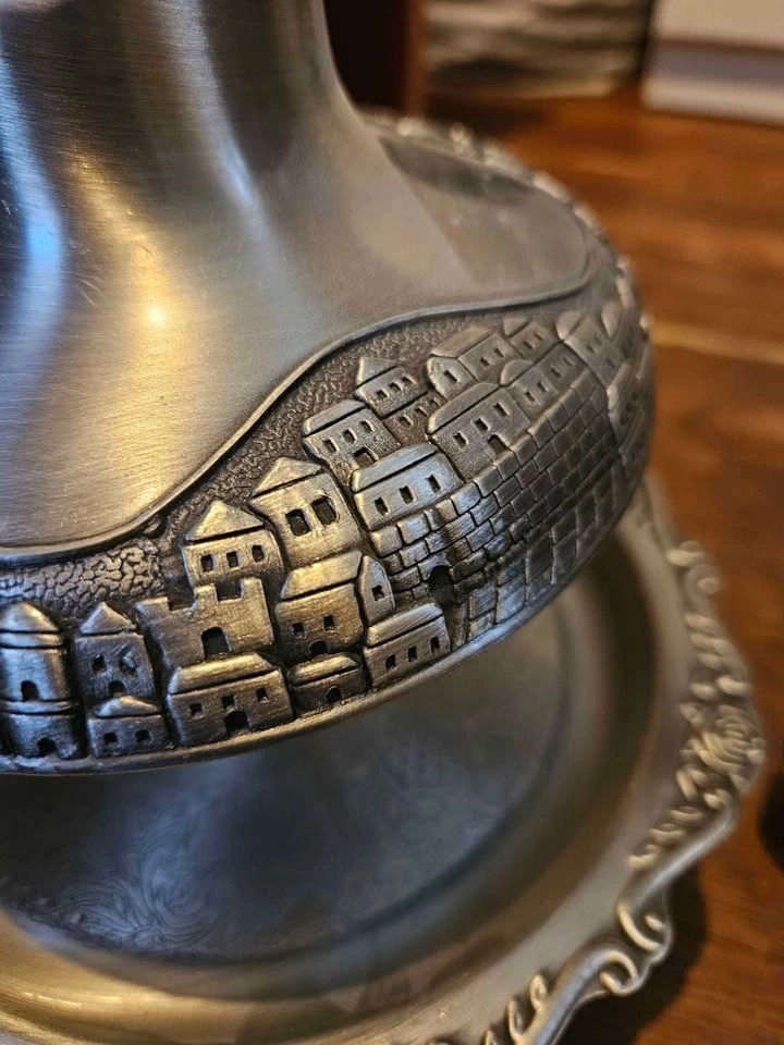 Vintage pewter-style shot dispenser set with 8 matching mini cups. Features a detailed Jerusalem-style city design around the base and cups. Liquid is poured into the top and dispenses through small spouts—great for serving drinks in a unique way. Let me know if you're interested!