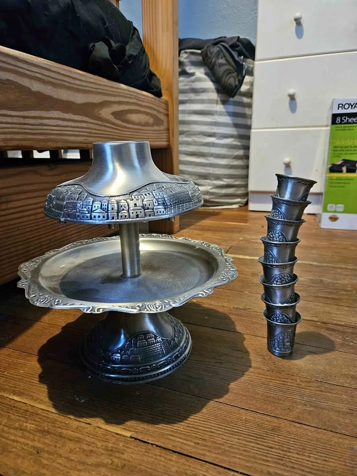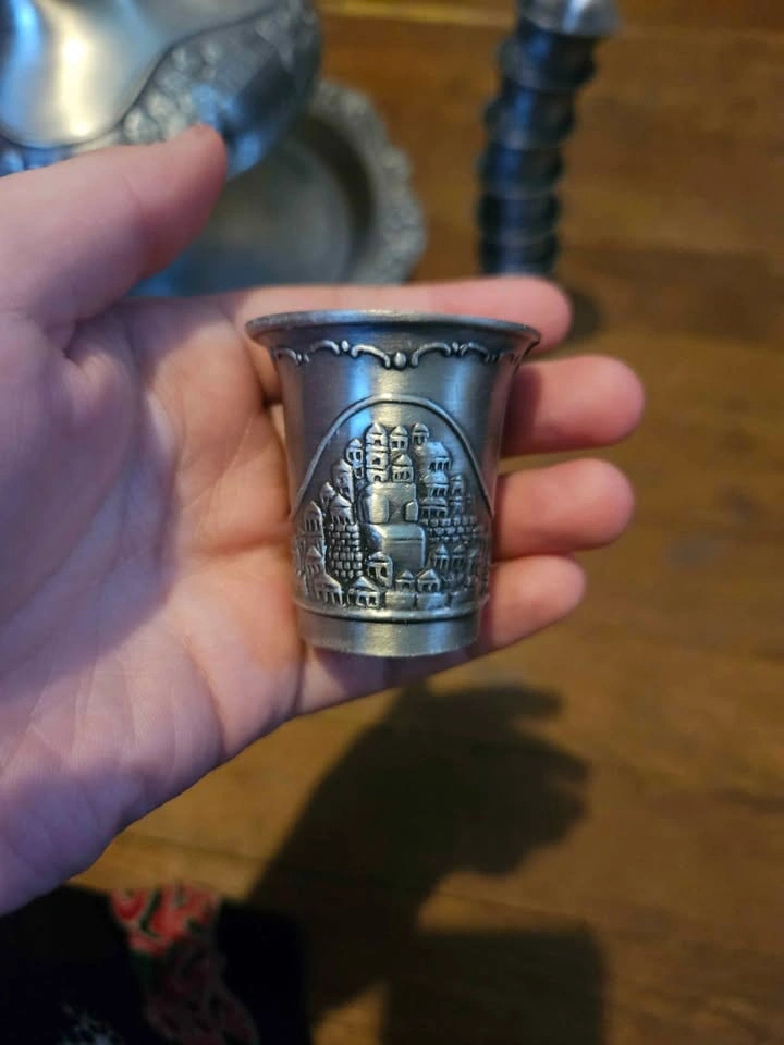 Vintage pewter-style shot dispenser set with 8 matching mini cups. Features a detailed Jerusalem-style city design around the base and cups. Liquid is poured into the top and dispenses through small spouts—great for serving drinks in a unique way. Let me know if you're interested!