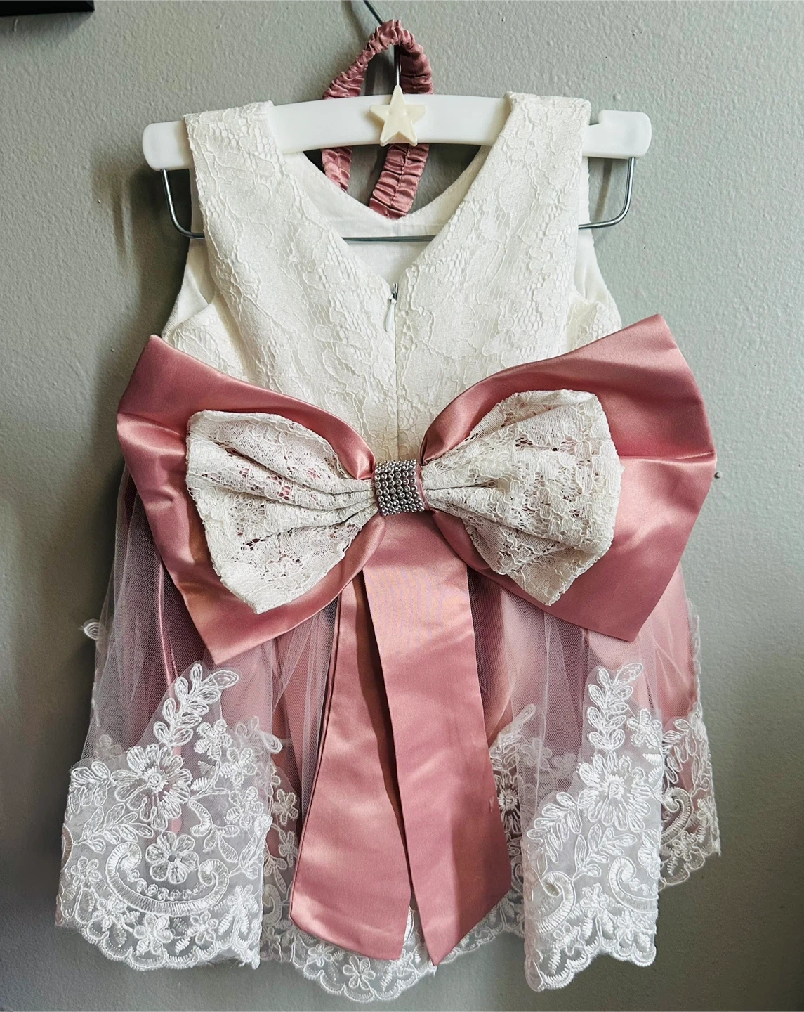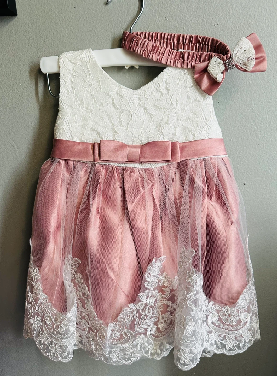 Size 12M. This cute baby girl's dress is perfect for special occasions. It's a lovely pink and white combination with lace and satin details. It includes a matching headband. Suitable for events like parties or photoshoots!