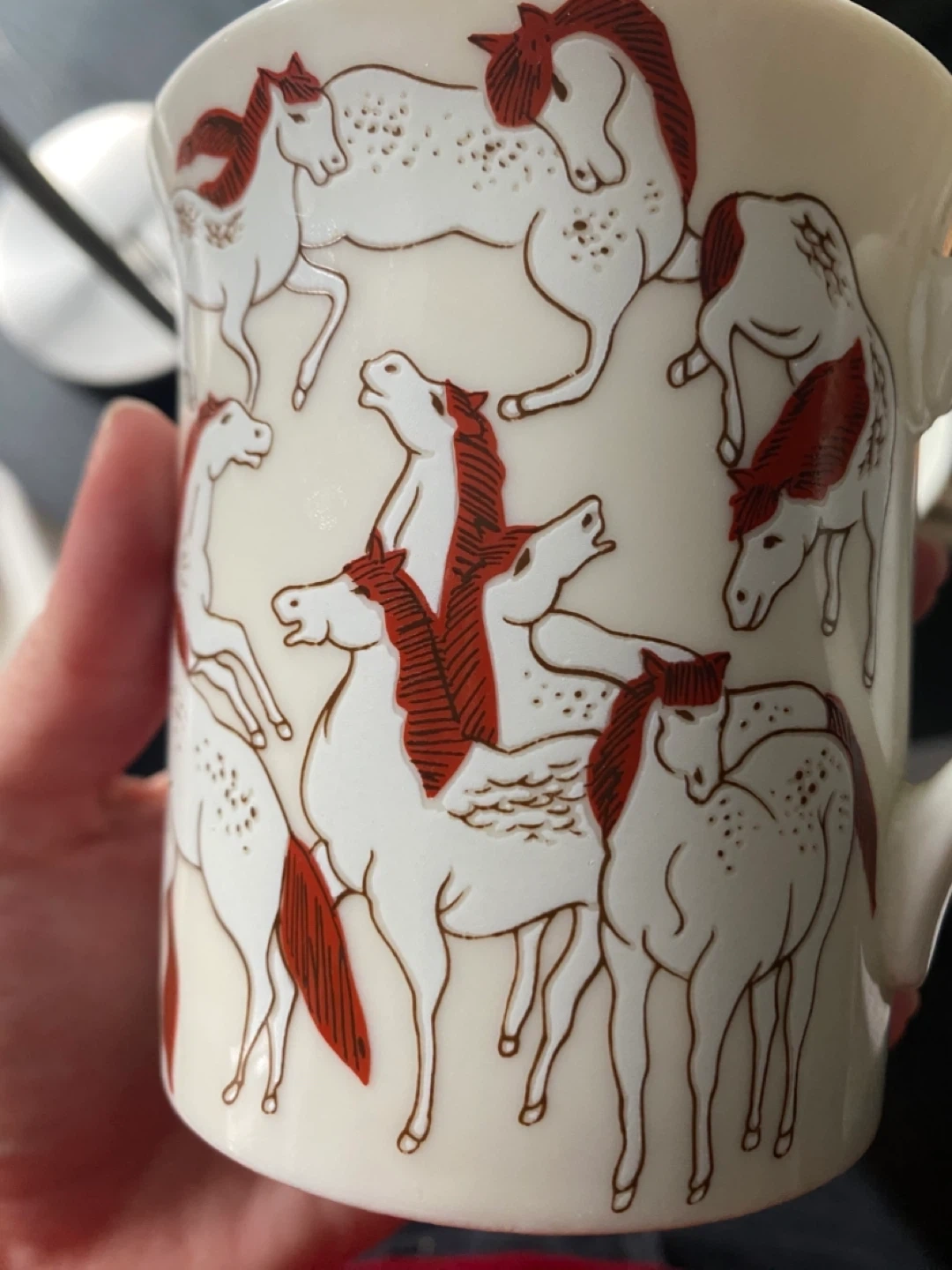 Rare vintage MCM mugs from Takahashi San Francisco (1950-1980s)! It features a unique 'A Hundred Stallions' design inspired by the T'ang Dynasty. It's hand-decorated and in perfect condition AND STAMP on bottom for proof of authenticity.