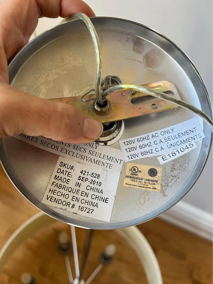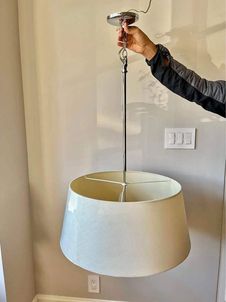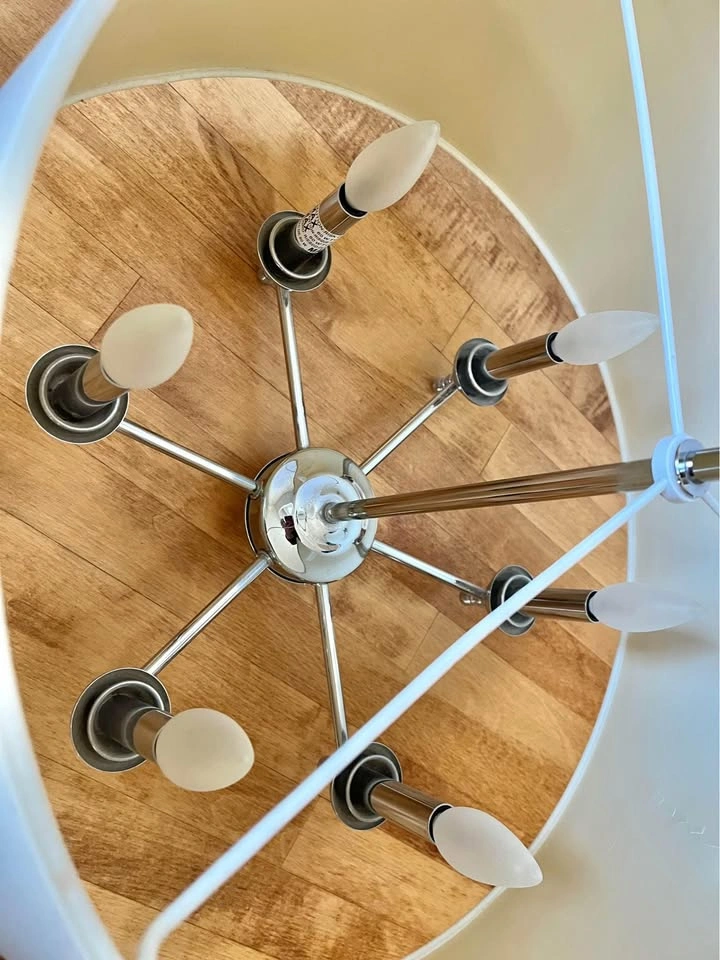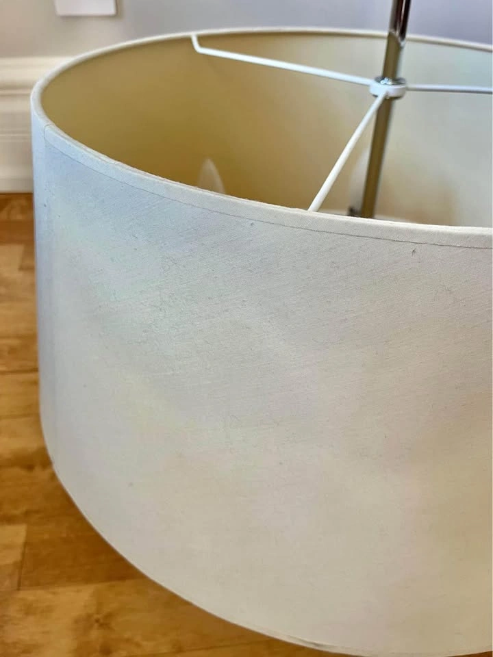 Gorgeous chandelier with large drum shade. The colour of the hardware is silver (chrome). Comes with the light bulbs.