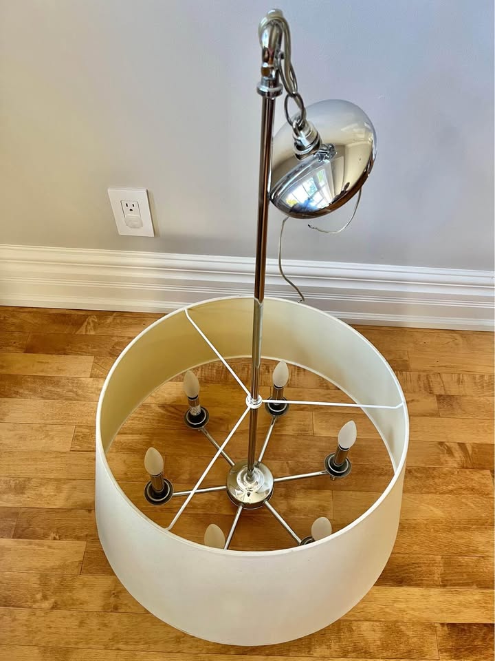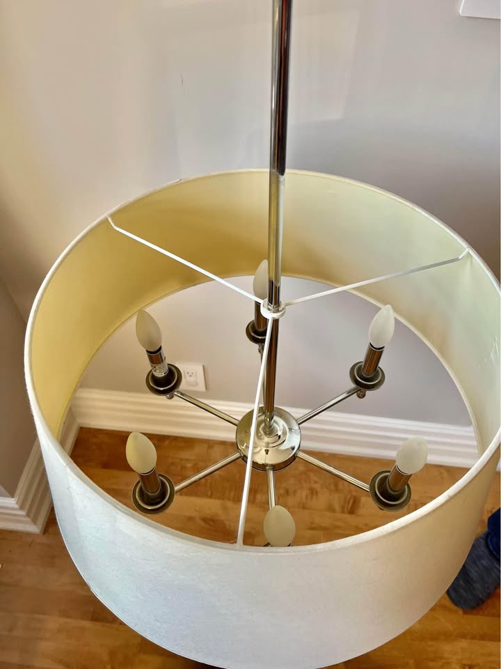 Gorgeous chandelier with large drum shade. The colour of the hardware is silver (chrome). Comes with the light bulbs.