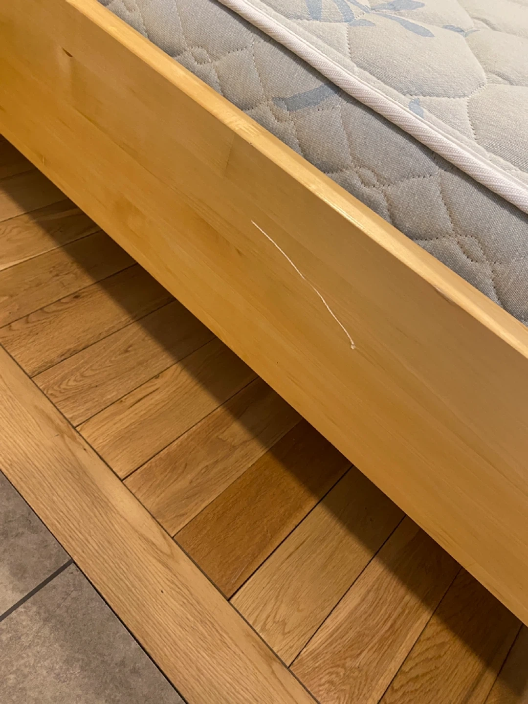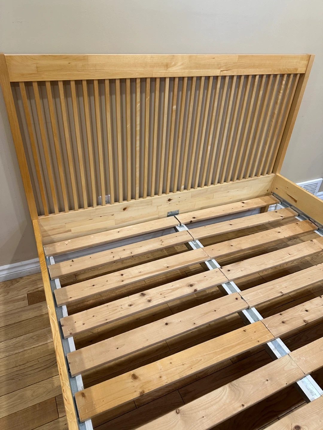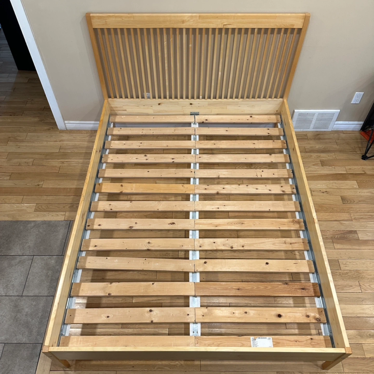IKEA queen bed frame in a natural birch finish with a clean Scandinavian design. Sturdy frame with a slatted headboard and wooden mattress support.