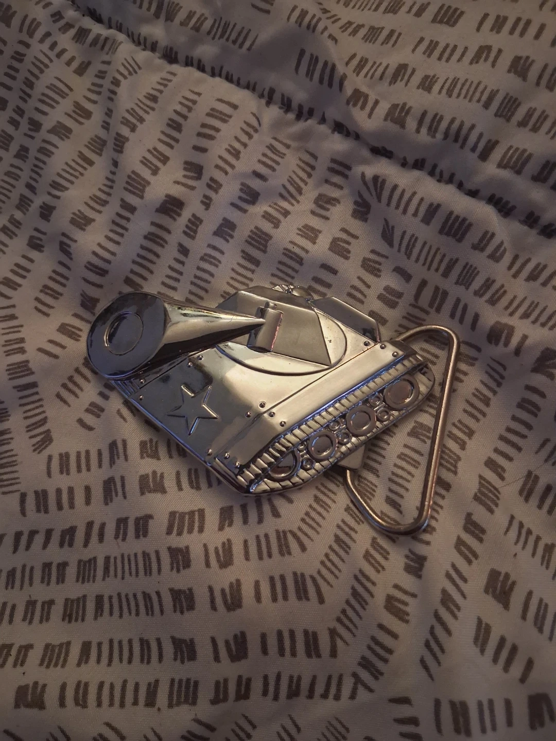 Here's a cool tank belt buckle! It's got a unique design and is in great shape. Perfect for adding a bit of personality to your outfit